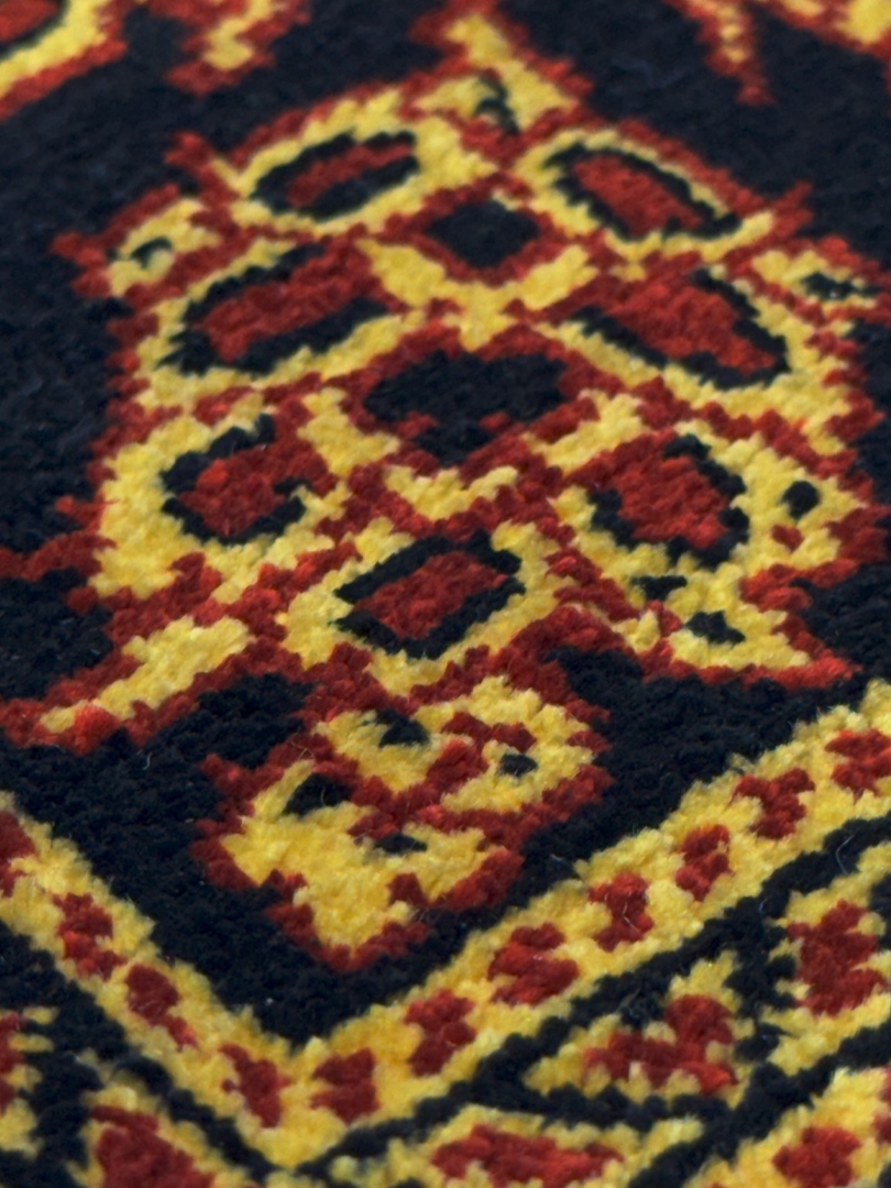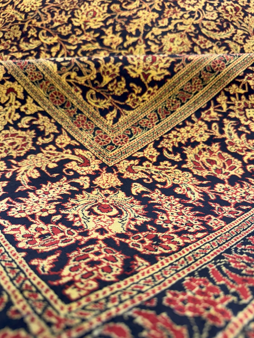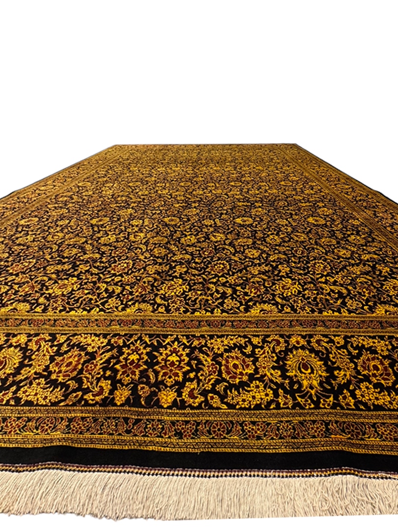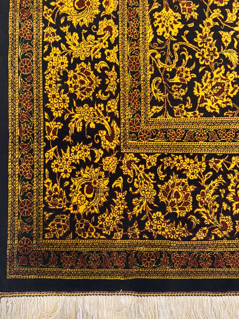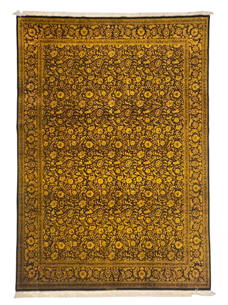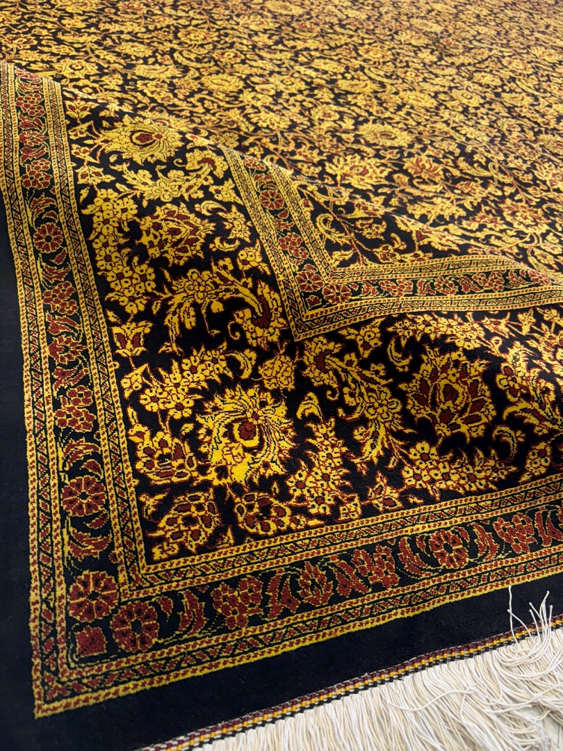 دست بافت قم 250*350 مستطيل افشان 70 رج تمام ابريشم مشکي طلايي 10 Kg