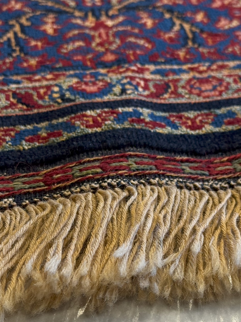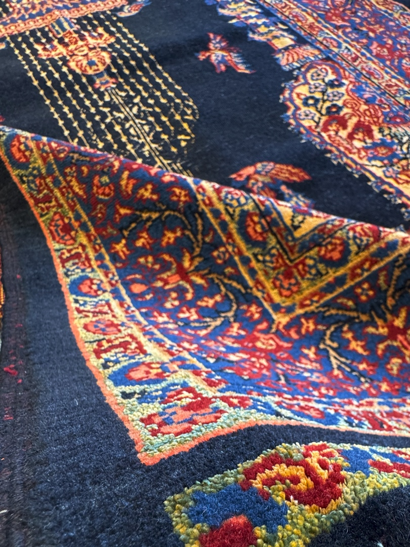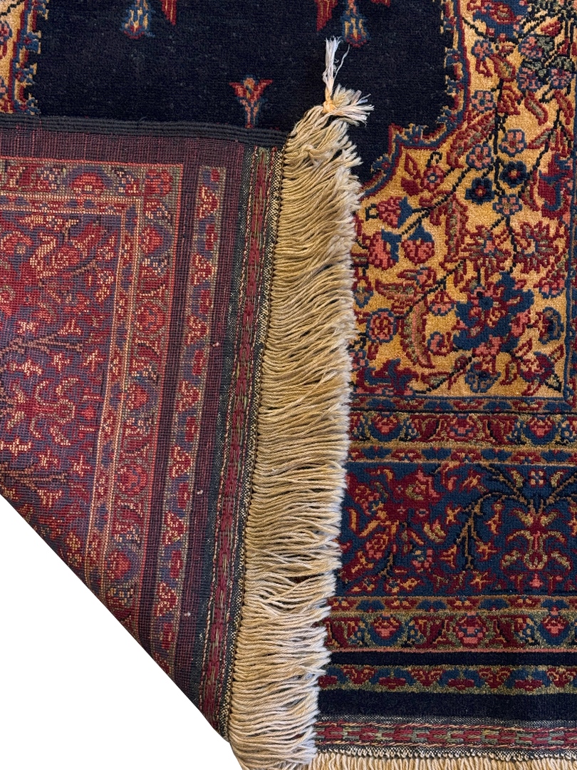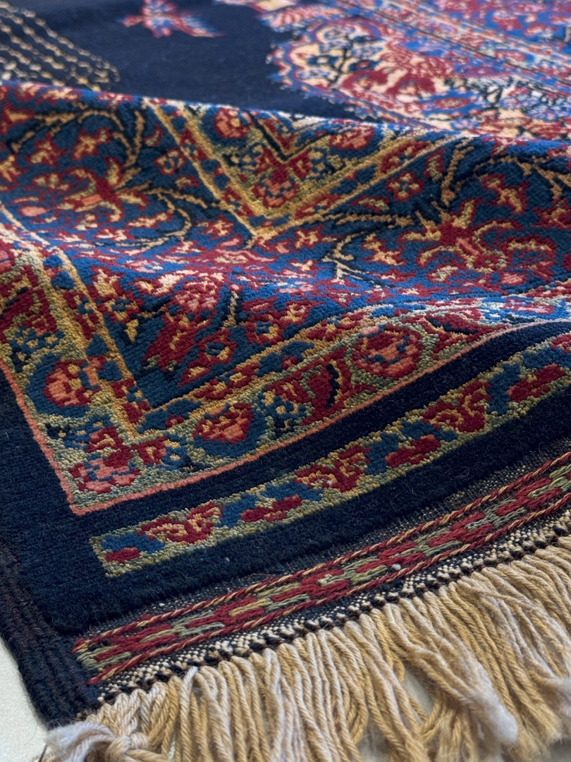 دست بافت عشايري 100*170 مستطيل فواره محرابي 40 رج پشم دست ريس سرمه اي سير آبي فيروزه اي 7 Kg