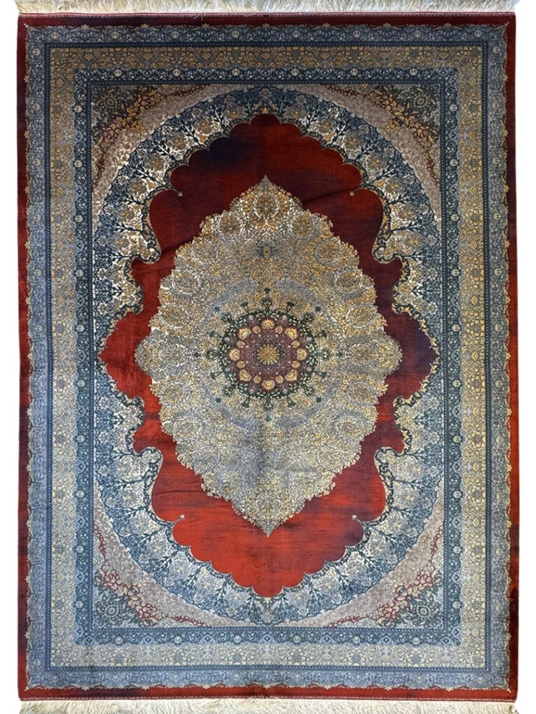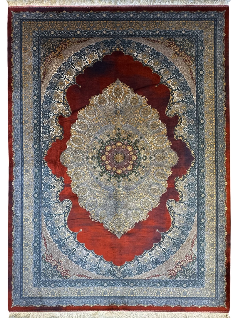 فرش شادکام > فروشگاه > فرش ربات بافت > فرش ربات بافت تمام ابریشم 2نخ مستطیل لچک ترنجی چهارباغ کد 2003537