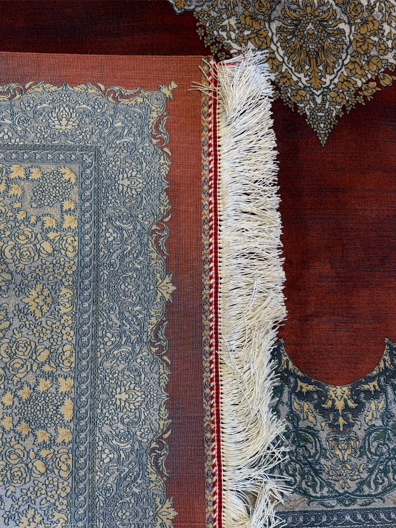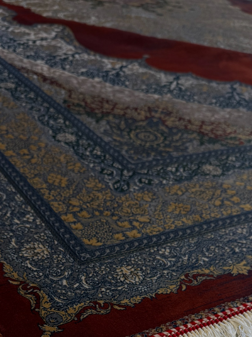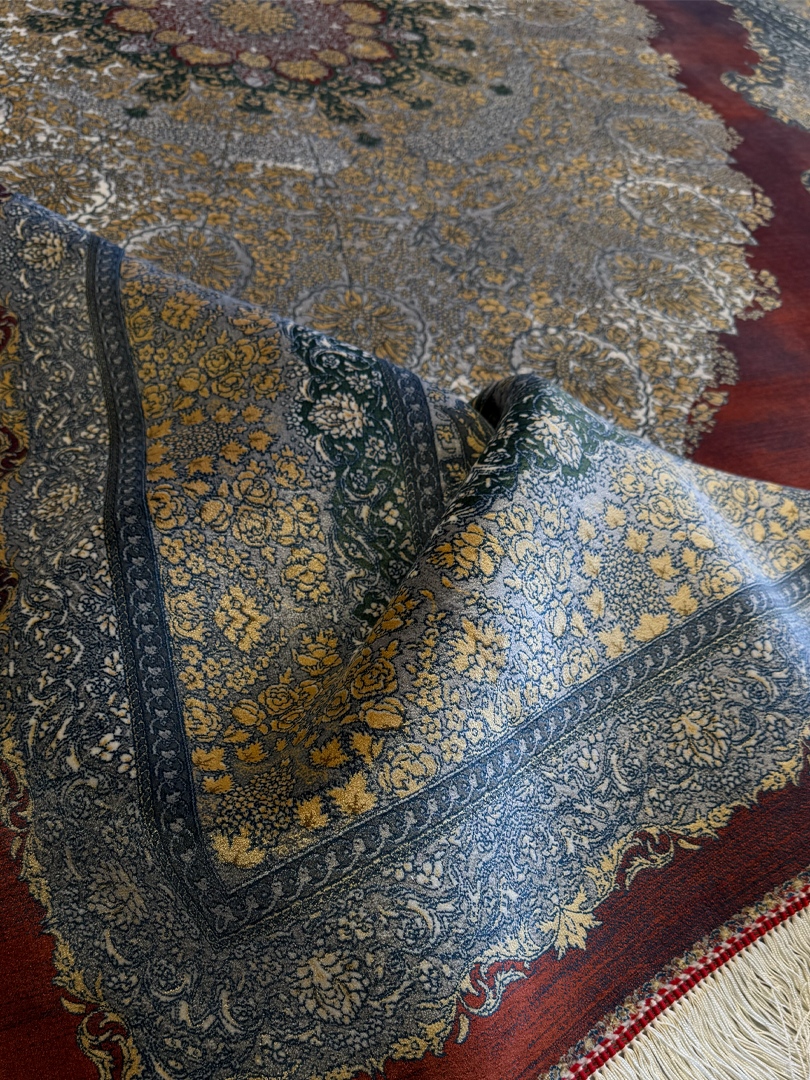ربات بافت تمام ابريشم 2 نخ 200*300 مستطيل لچک ترنجي چهارباغ 70 رج کرک و بمبوسيلک سورمهاي عنابي طوسي الوان 25 Kg