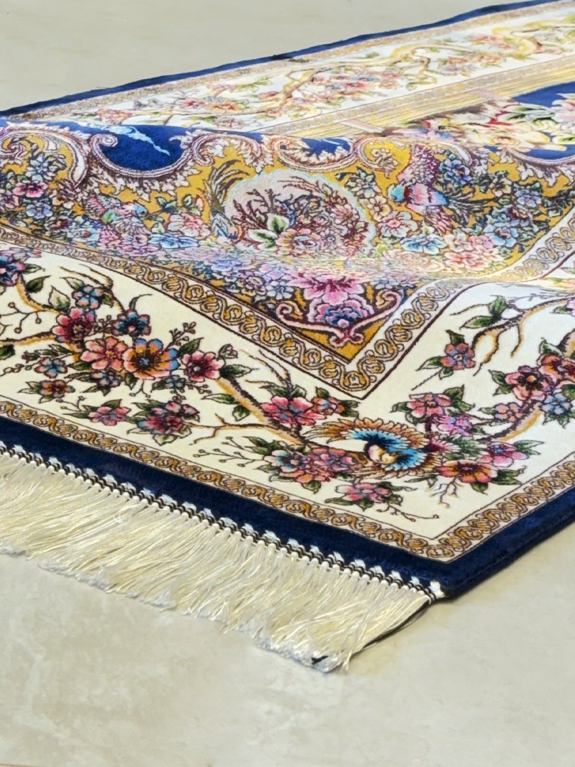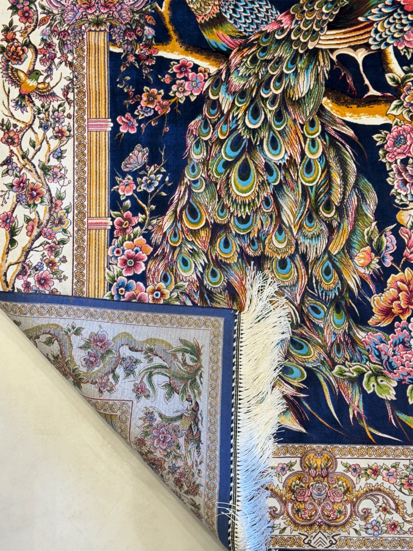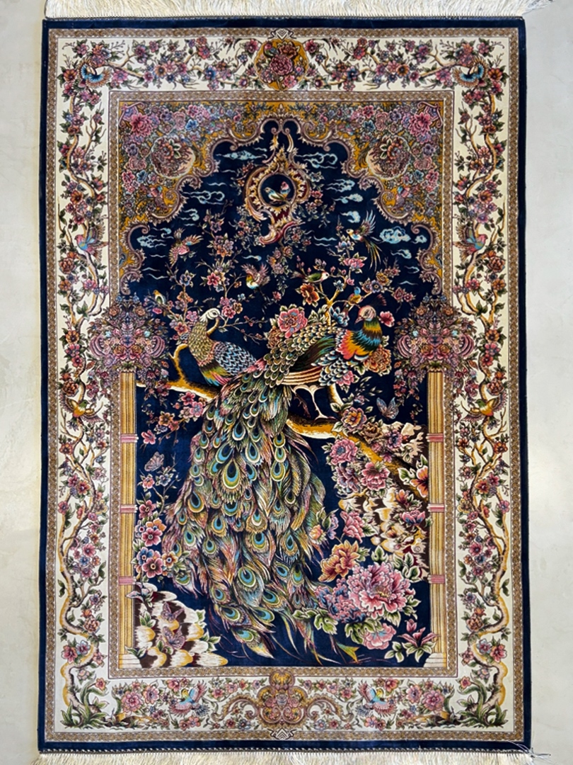 ربات بافت قم 100*150 مستطيل باغ طاووس 70 رج ابريشم و بنبوسيلک سورمهاي کرم 3 Kg