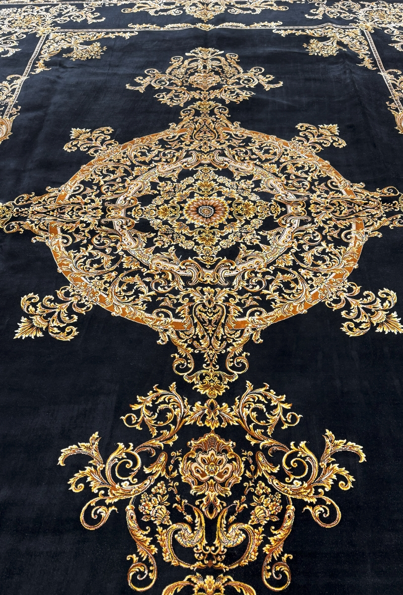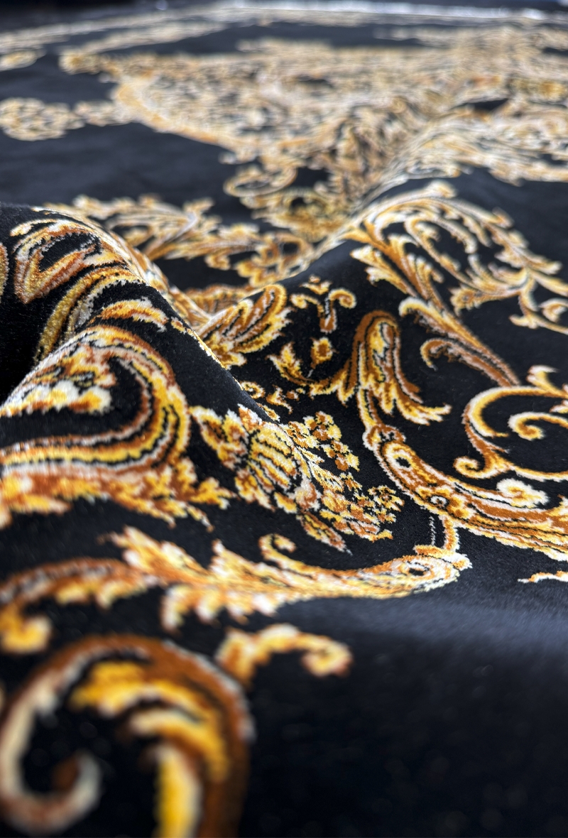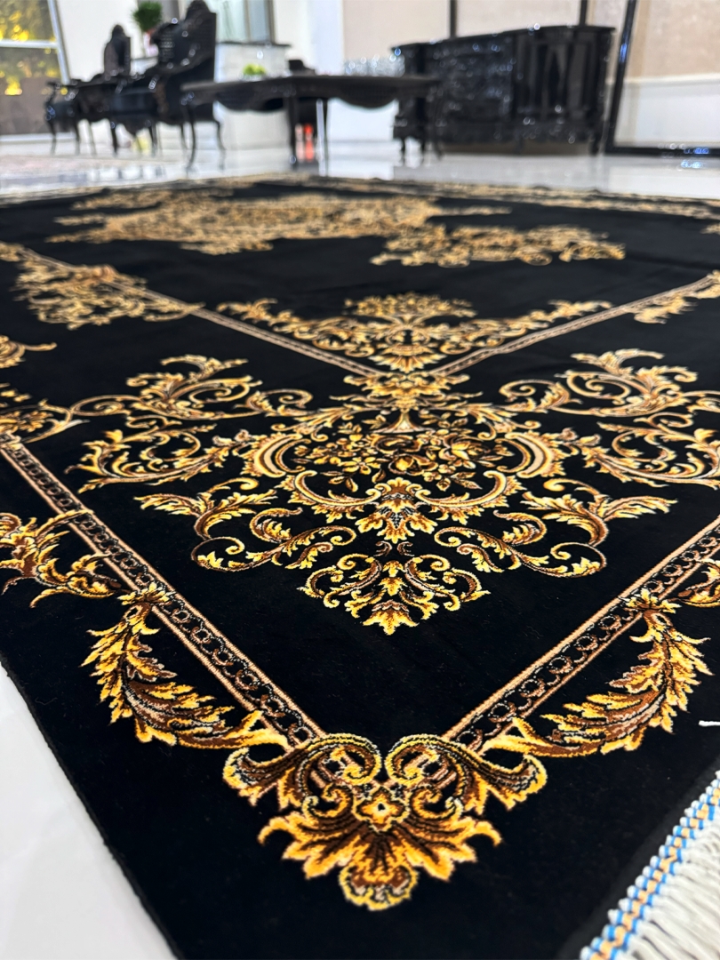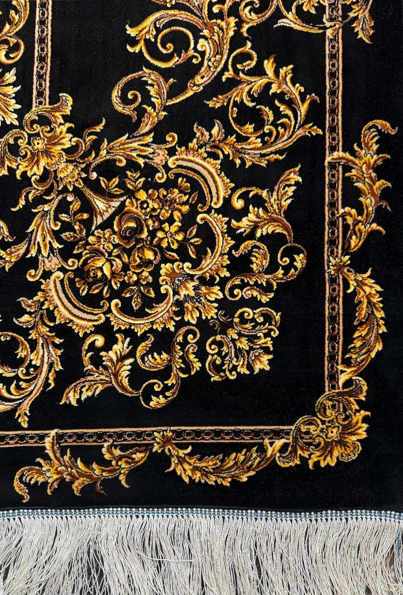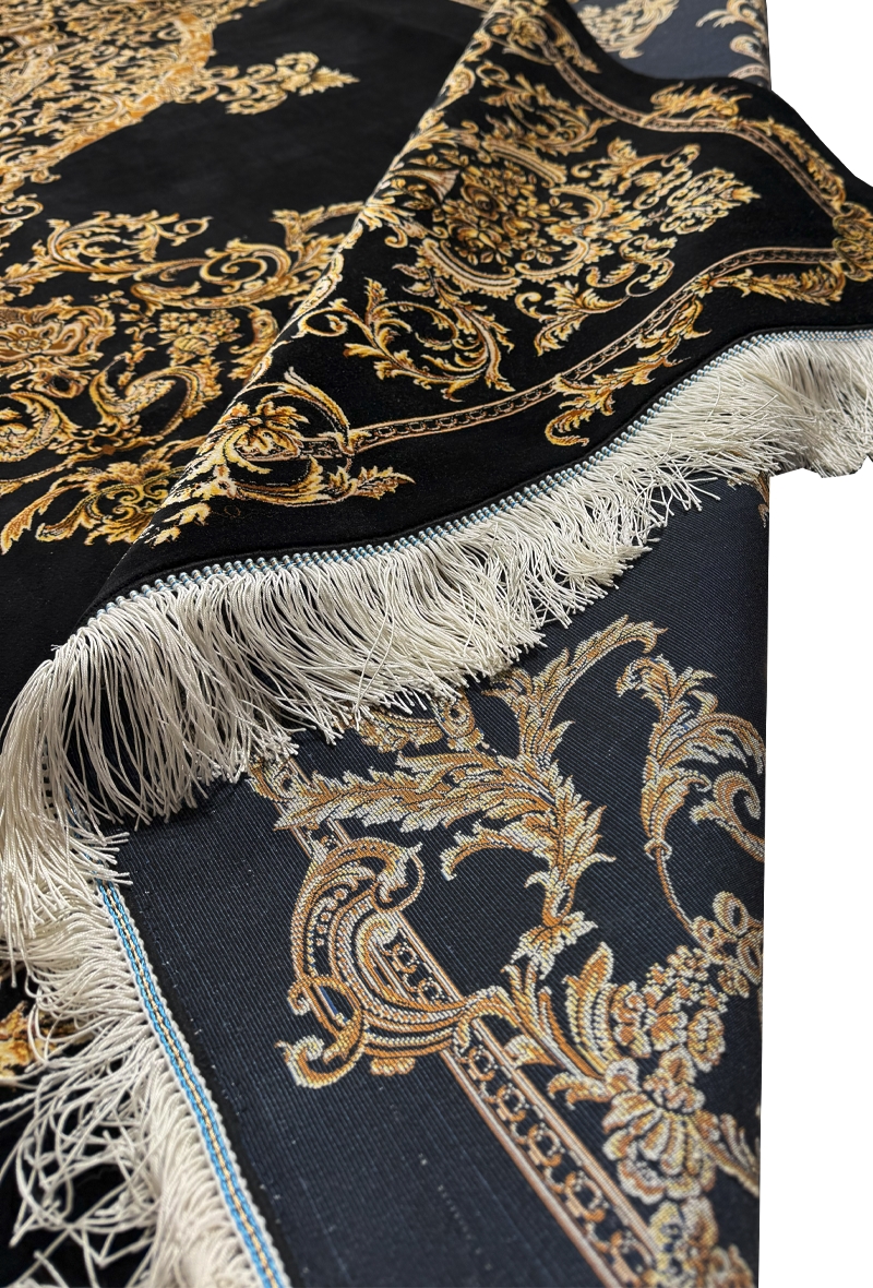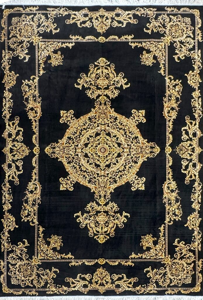 ربات بافت قم 150*225 مستطيل ورساچه 70 رج ابريشم و بنبوسيلک مشکي طلايي مشکي طلايي 10 Kg