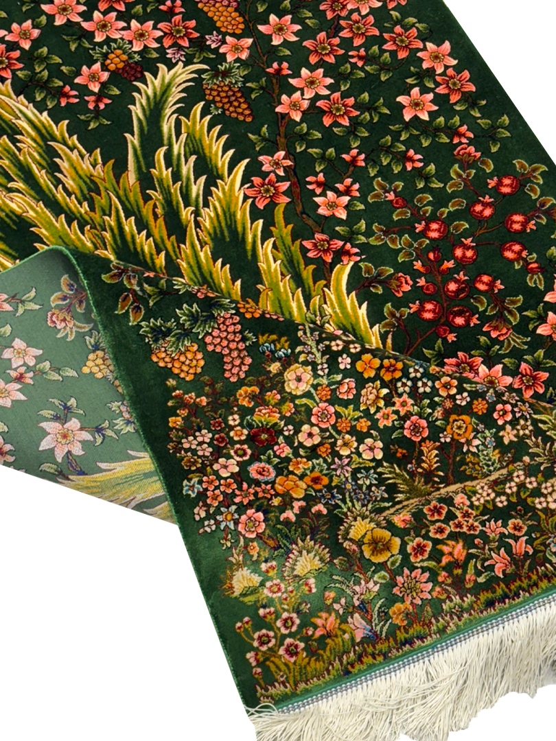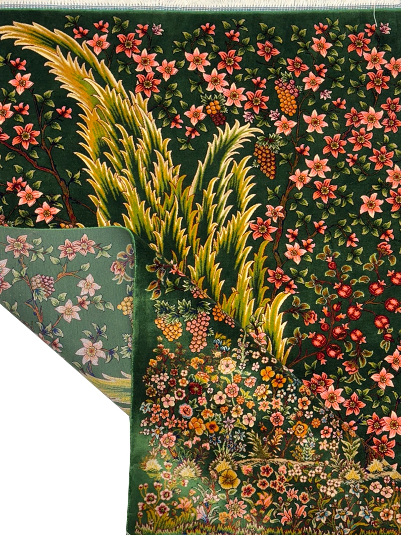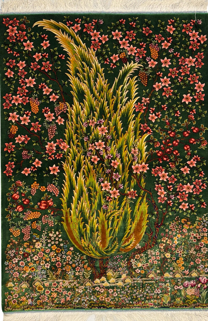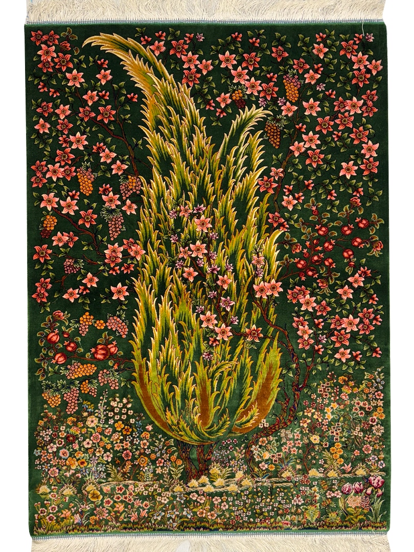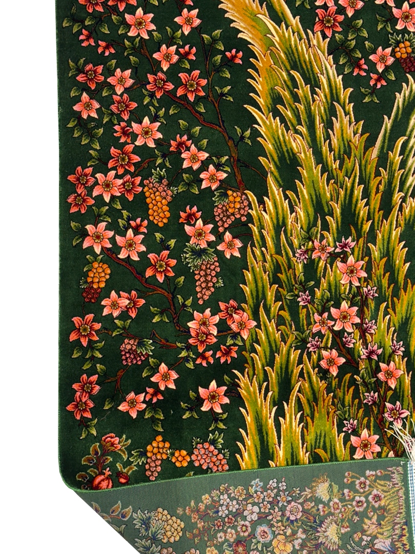 ربات بافت قم 80*120 مستطيل درخت سروي 70 رج ابريشم و بنبوسيلک سبز سبز kg1