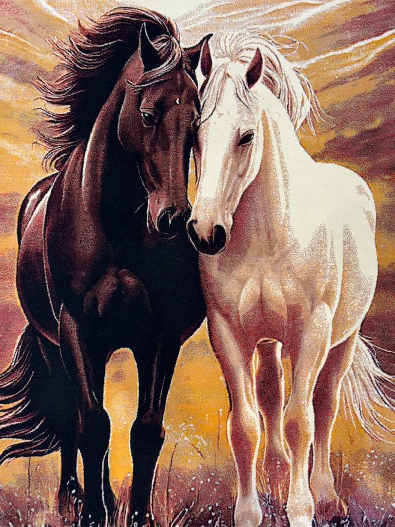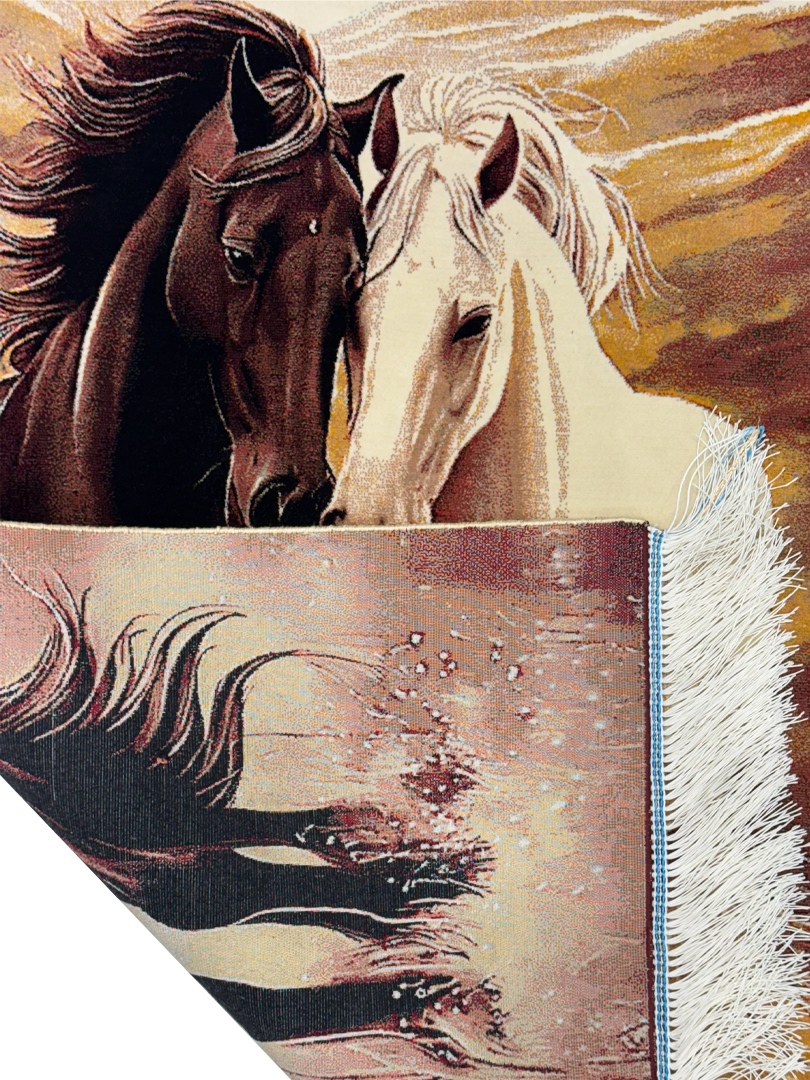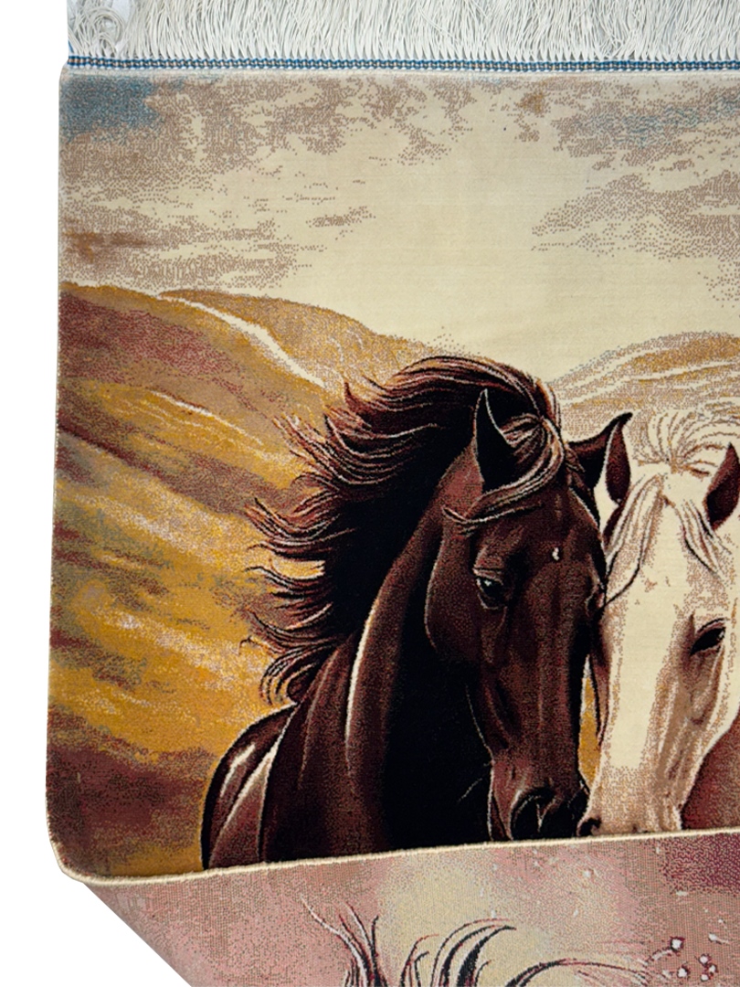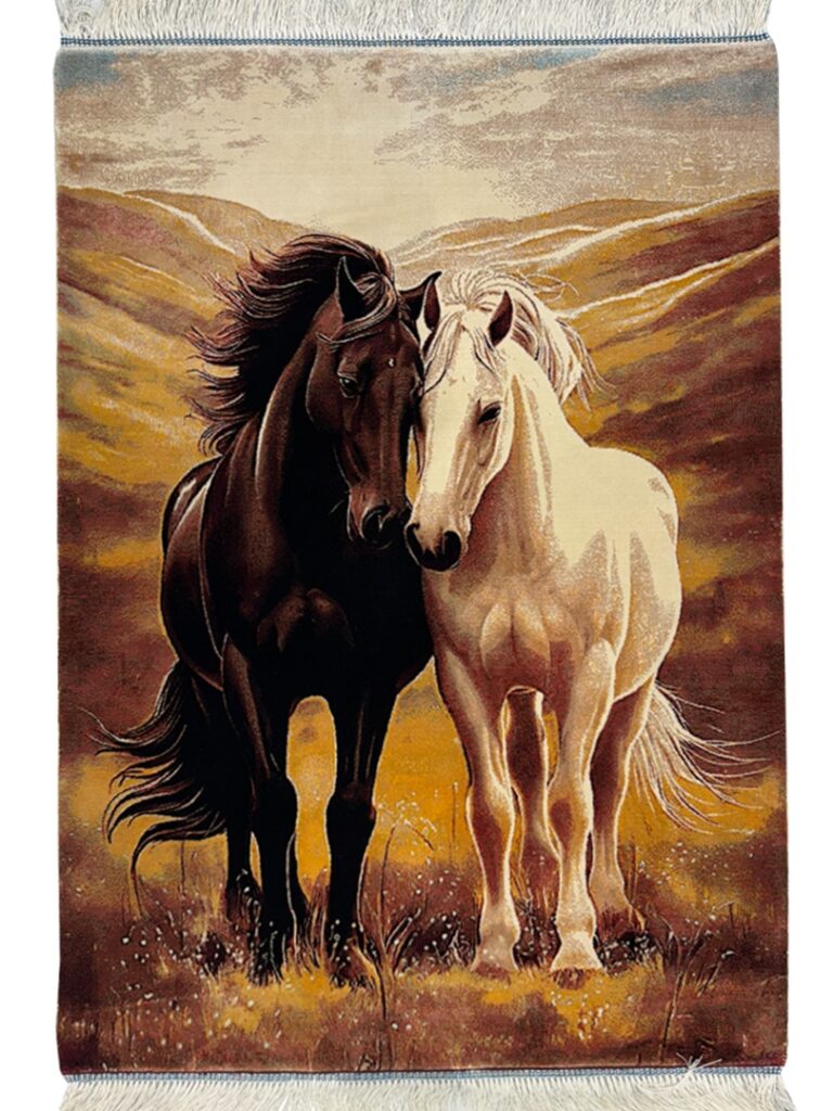 ربات بافت قم 60*90 مستطيل دو اسب 70 رج ابريشم و بنبوسيلک مشکي الوان کرم kg1