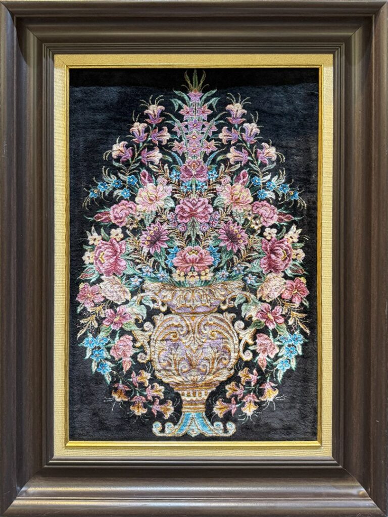 تابلو فرش قم گلدانی برجسته بافی 70 رج تمام ابریشم کد 2003278