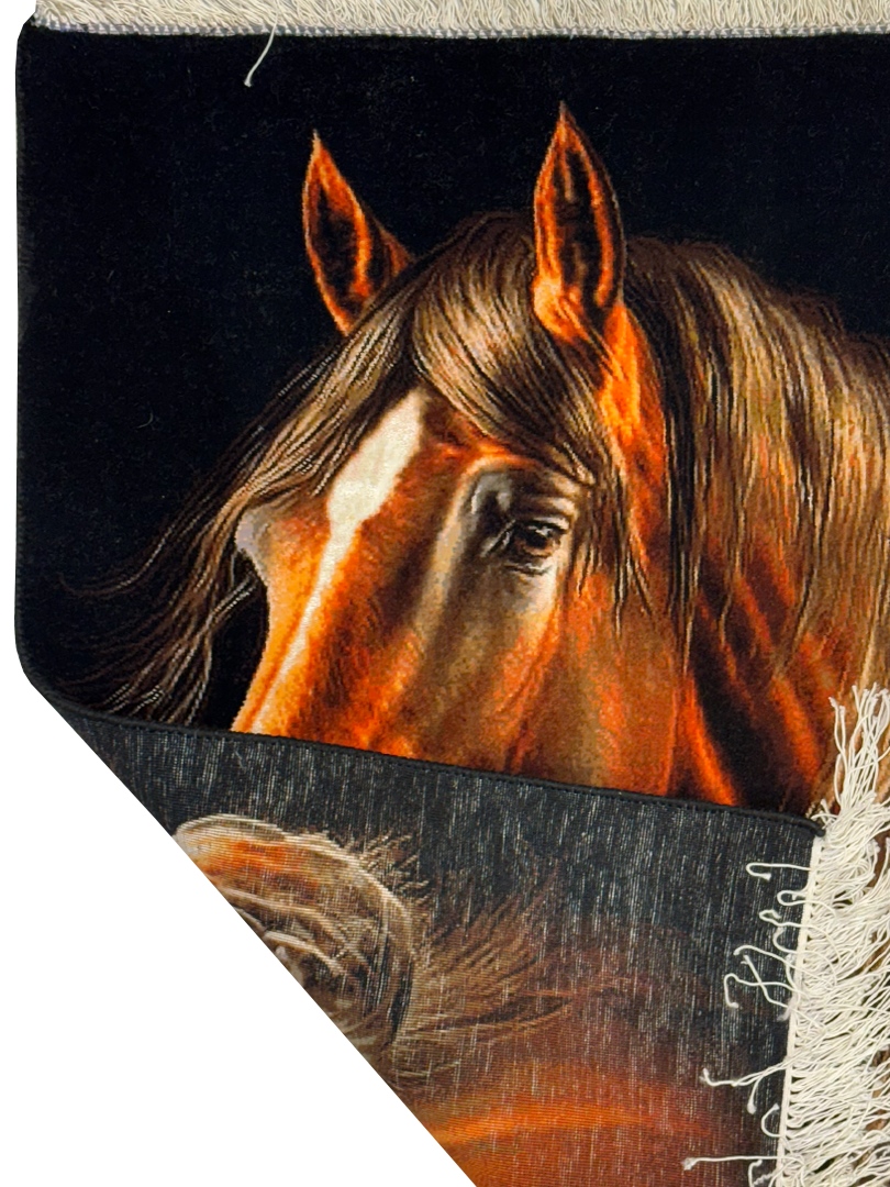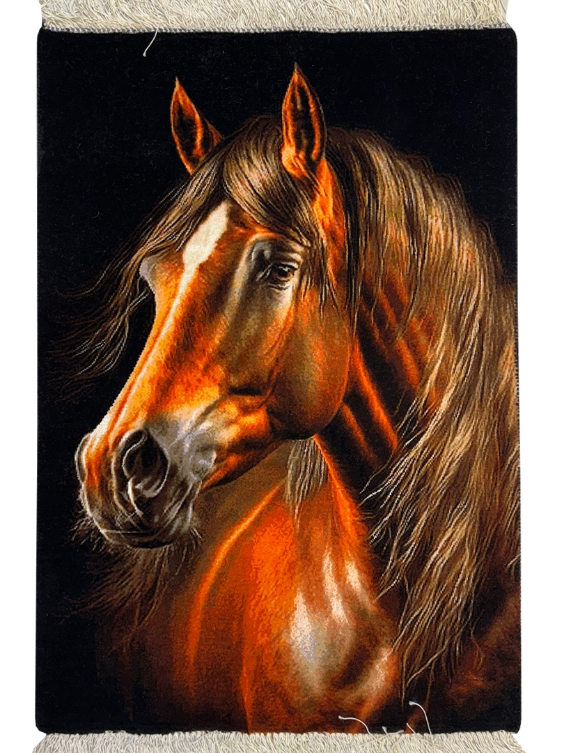 تابلو فرش تبريز 35*59 مستطيل اسب 50 رج کرک و ابريشم مشکي الوان kg1