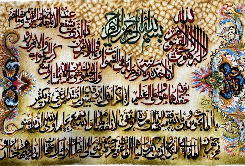 تابلو فرش تبريز 110 * 60 مستطيل * ايات قراني (قرياني) 50 رج پشم و ابريشم الوان الوان 2 Kg