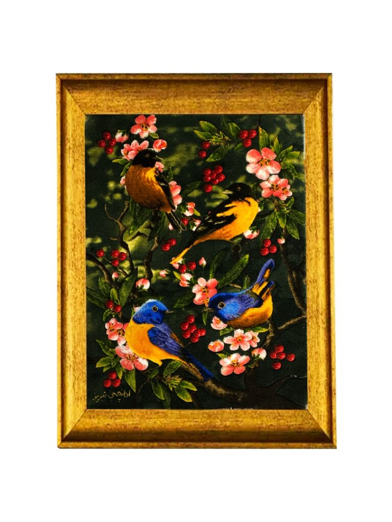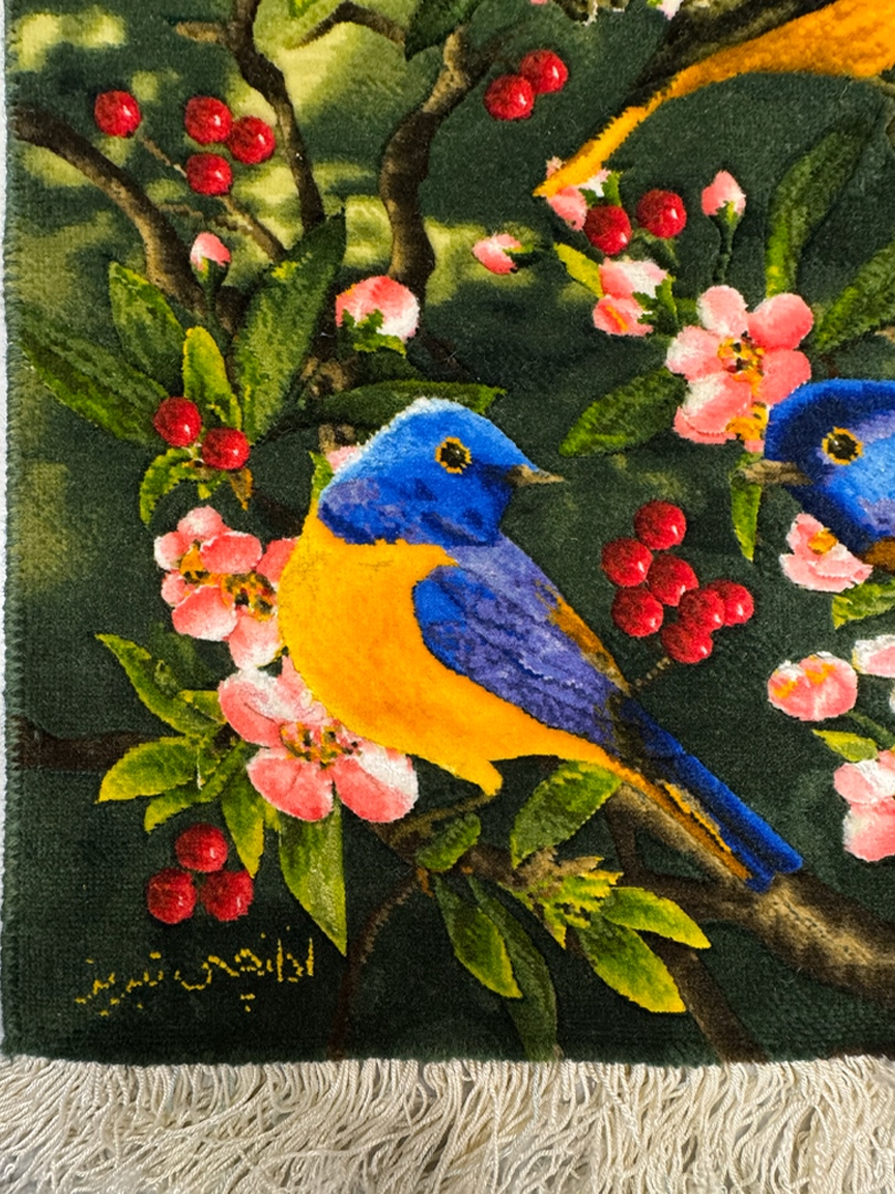 تابلو فرش تبريز 55*40 مستطيل باغ پرندگان اذانچي 50 رج کرک و ابريشم سبز الوان الوان 2 Kg