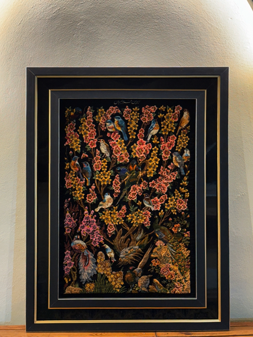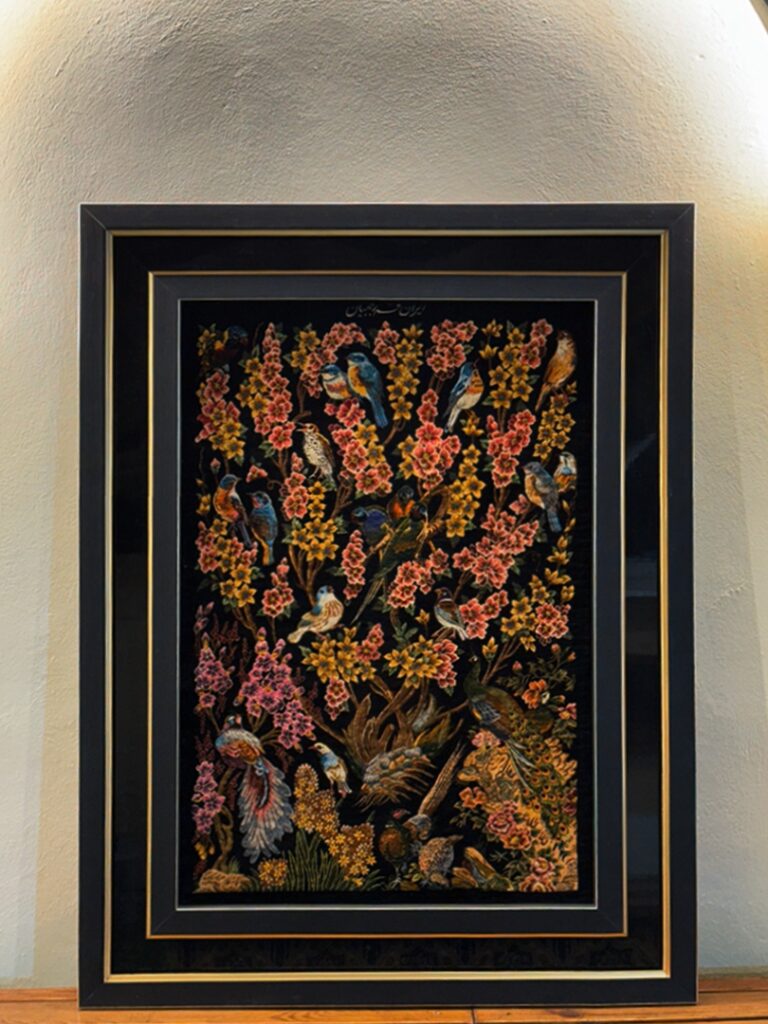 تابلو فرش قم 60*90 مستطيل باغ پرندگان رجبيان 70 رج تمام ابريشم مشکي الوان kg1