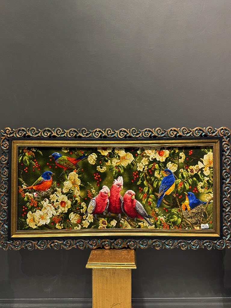 تابلو فرش تبريز 130*52 مستطيل باغ پرندگان عرضي 50 رج کرک و ابريشم الوان 1.5 KG