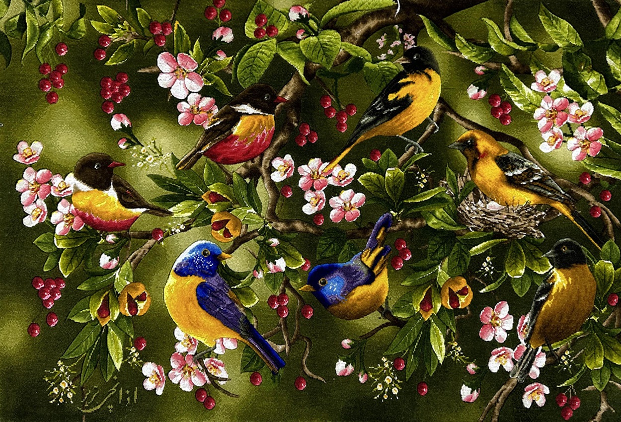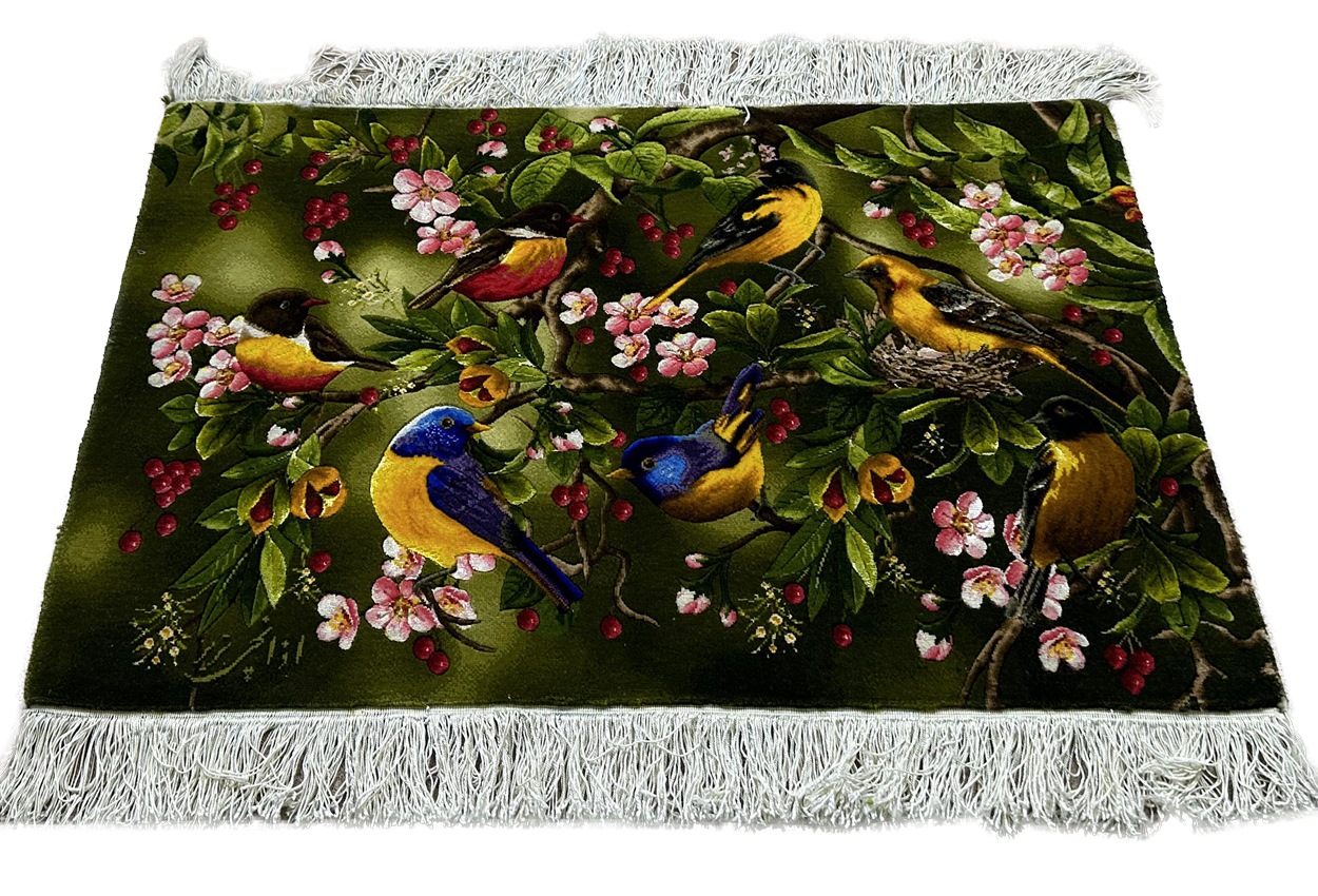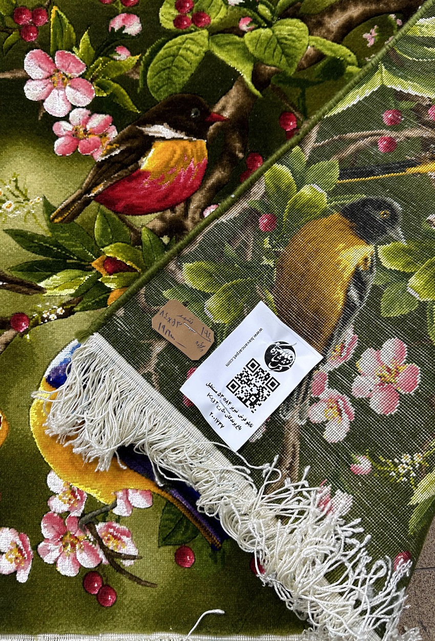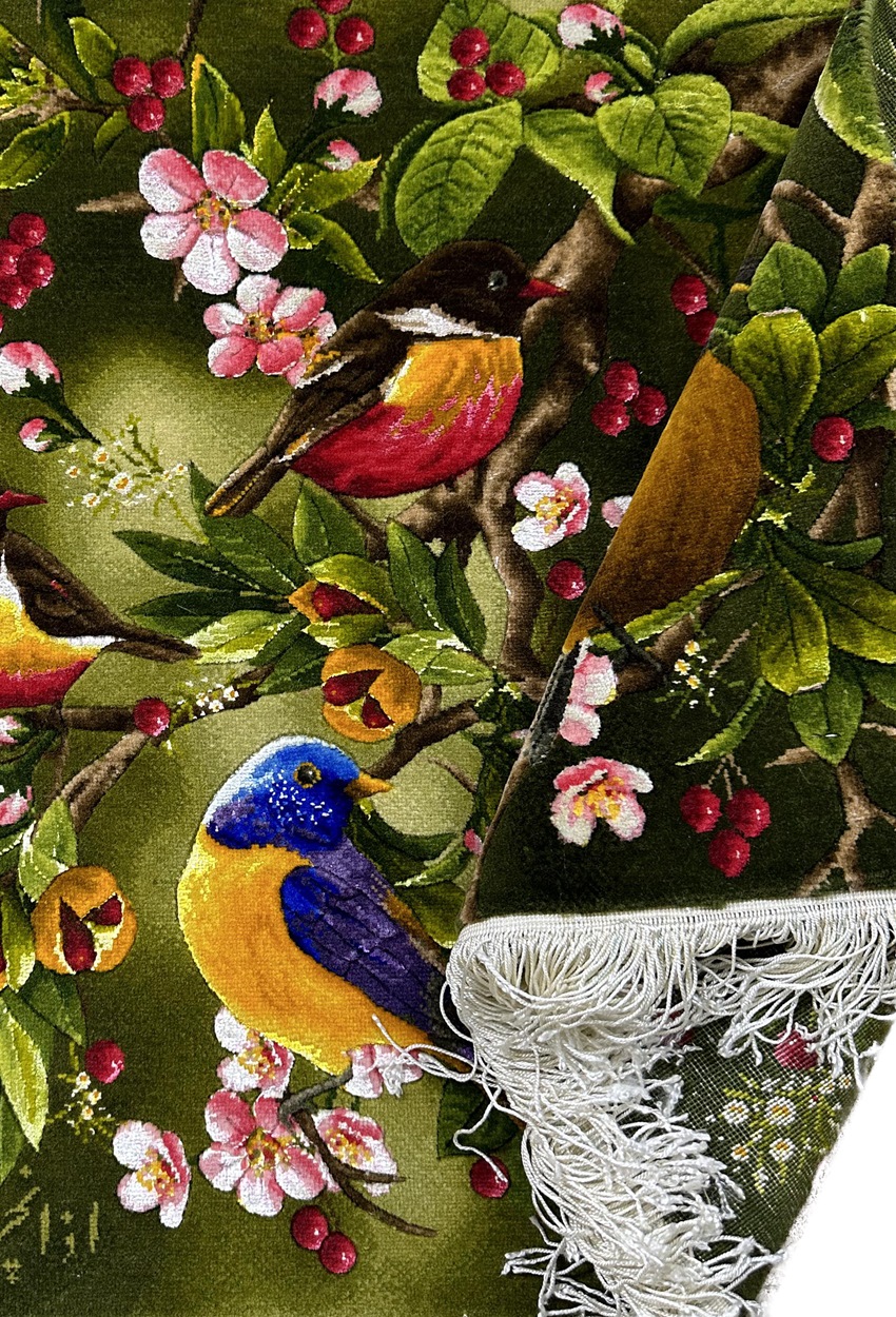 تابلو فرش تبريز 84*53 مستطيل باغ پرندگان 50 رج کرک و ابريشم سبز سبز 2 Kg