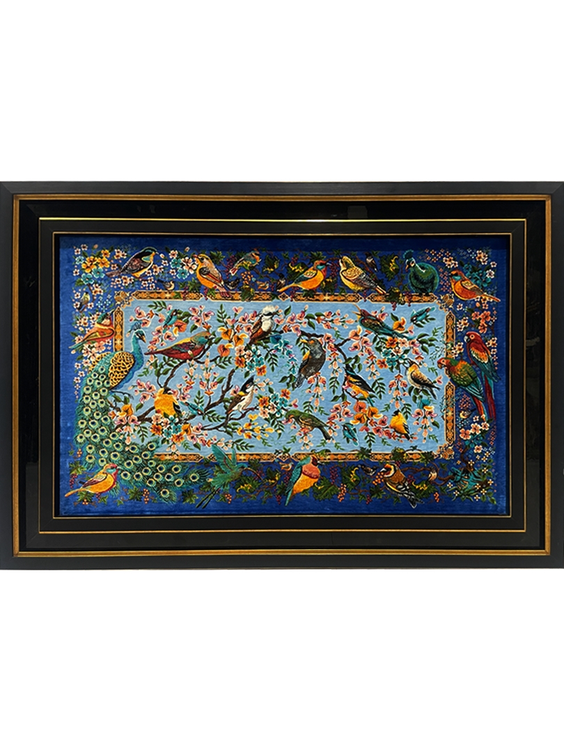 تابلو فرش قم 80*120 مستطيل درخت زندگي 70 رج تمام ابريشم ابي اسماني سورمه‌اي 5 Kg