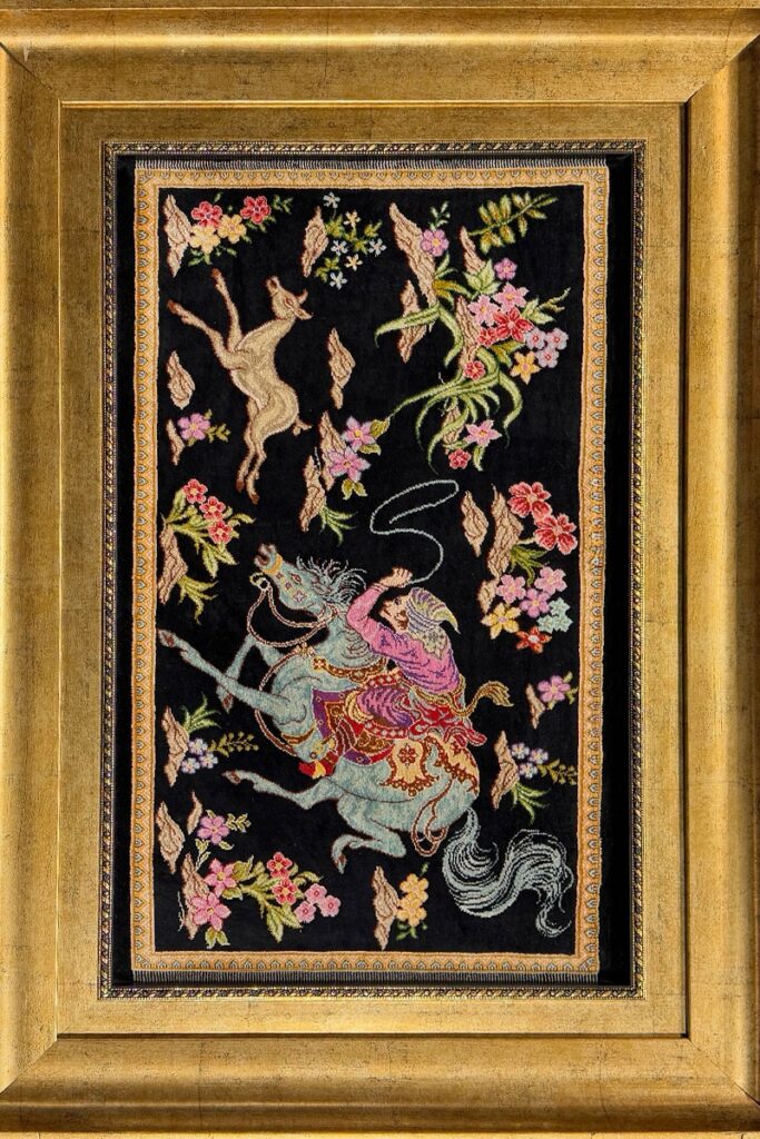 تابلو فرش قم 60*35 مستطيل شکارگاه 70 رج تمام ابريشم مشکي مشکي کرم 2 Kg ک