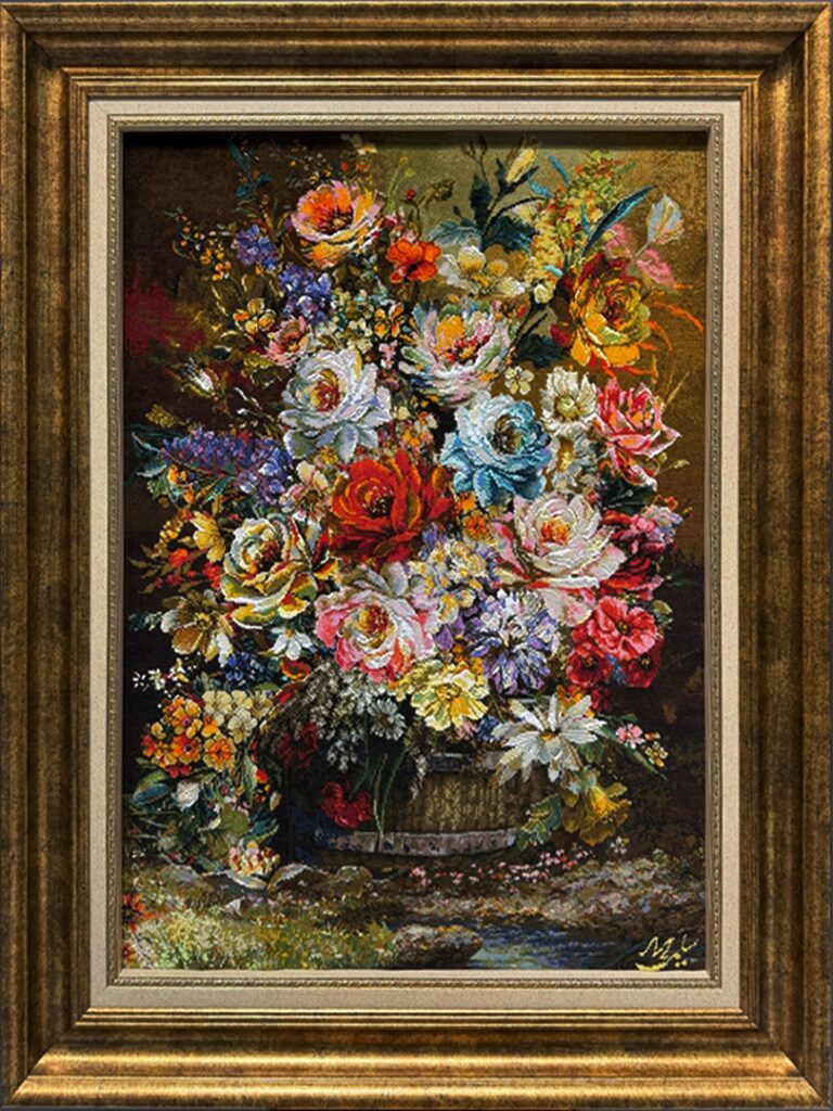 تابلو فرش تبريز 58*80 مستطيل گل سطلي 50 رج کرک و ابريشم الوان الوان 1.5