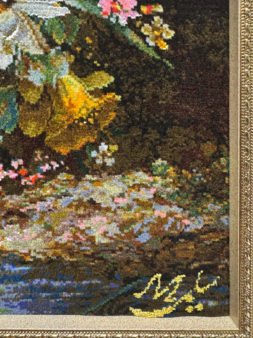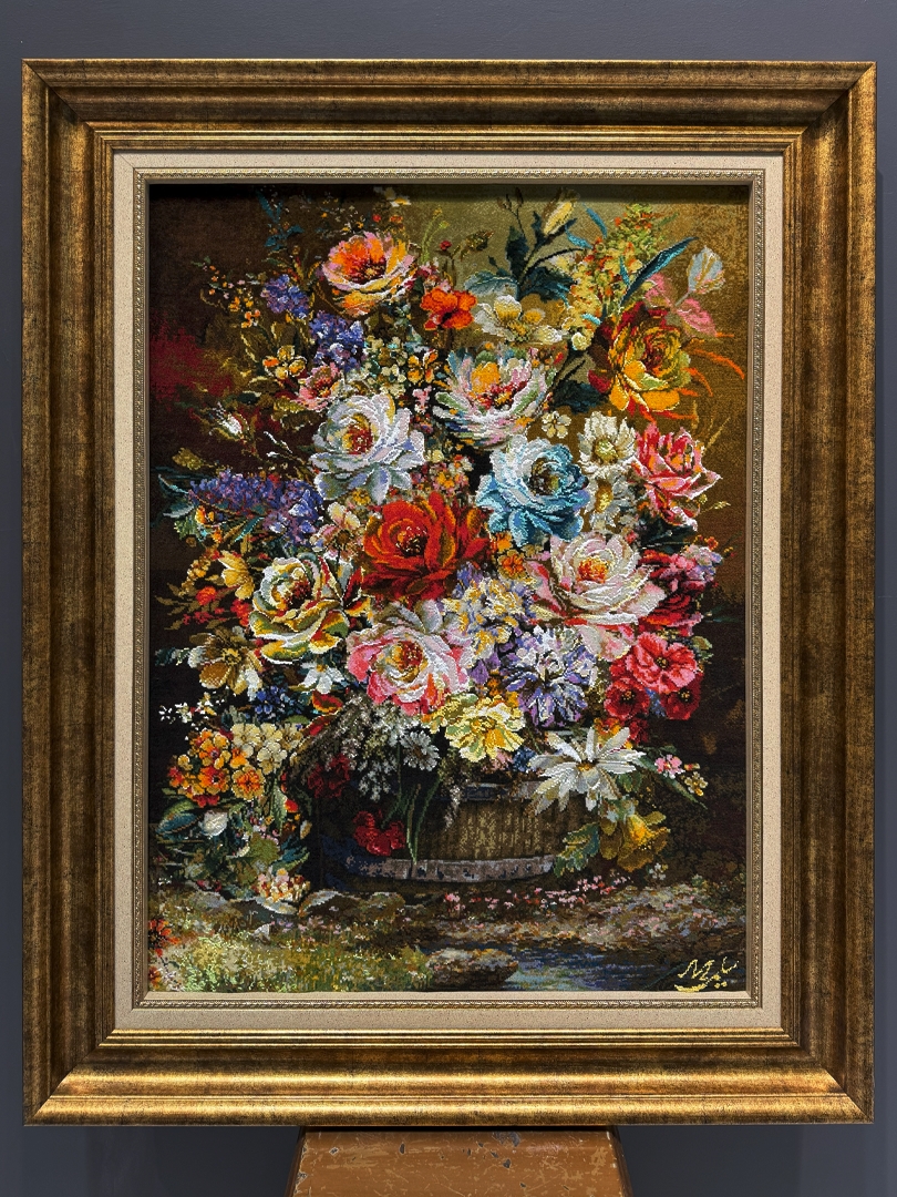 تابلو فرش تبريز 58*80 مستطيل گل سطلي 50 رج کرک و ابريشم الوان الوان 1.5