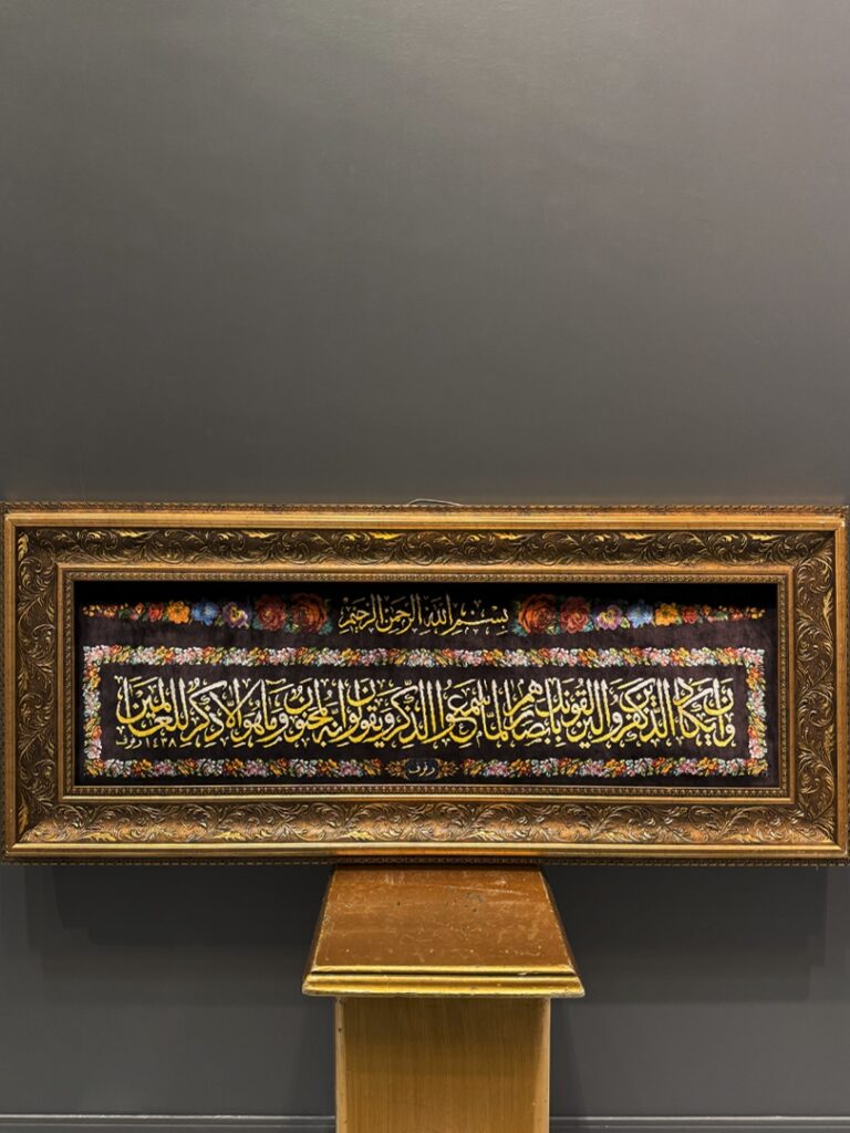 تابلو فرش قم 50*100 مستطيل و ان يکاد 70 رج تمام ابريشم طلايي و زرشکي طلايي و زرشکي 2 Kg