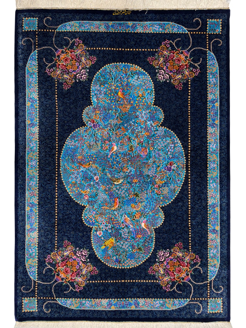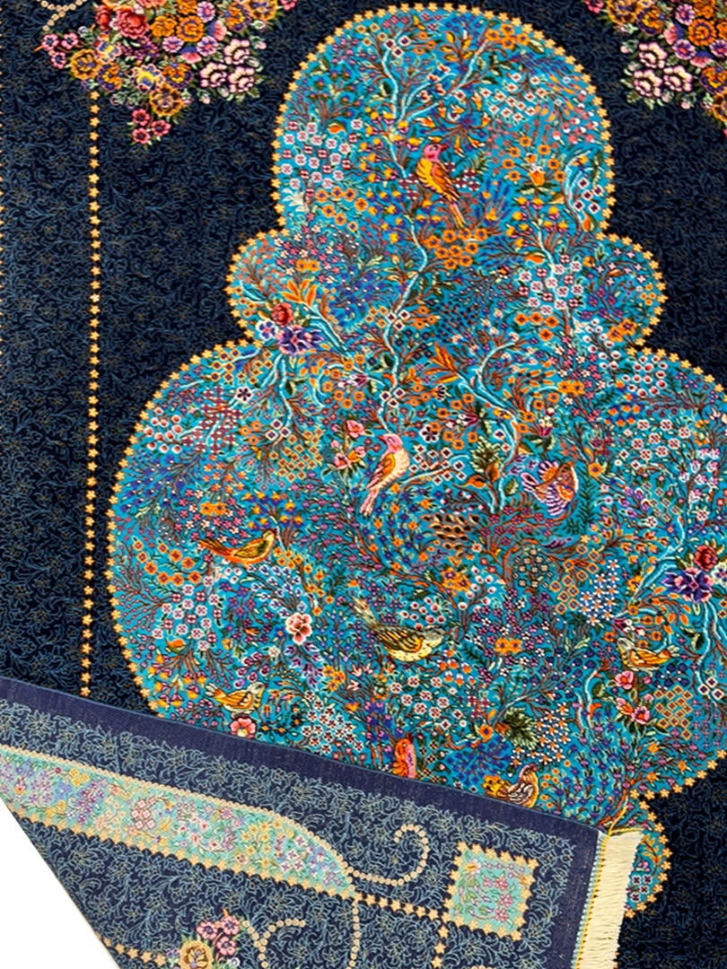 دست بافت قم 100*150 مستطيل ترنچ درخت زندگي 70 رج تمام ابريشم سورمهاي سورمهاي 3 Kg