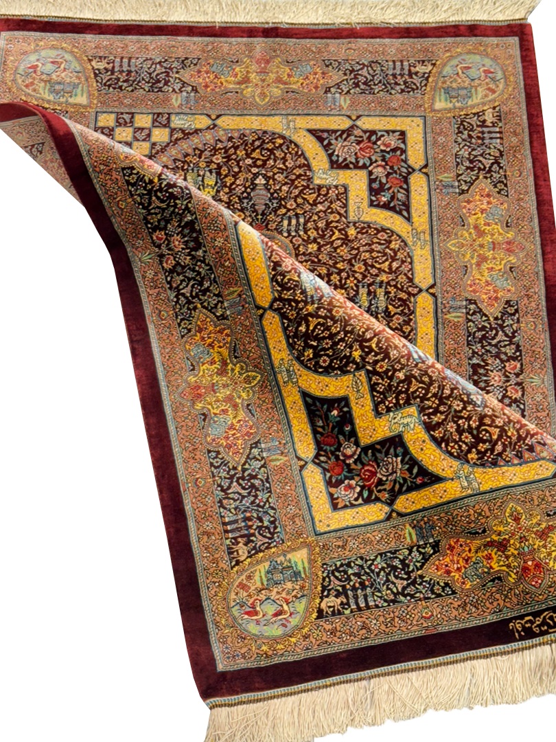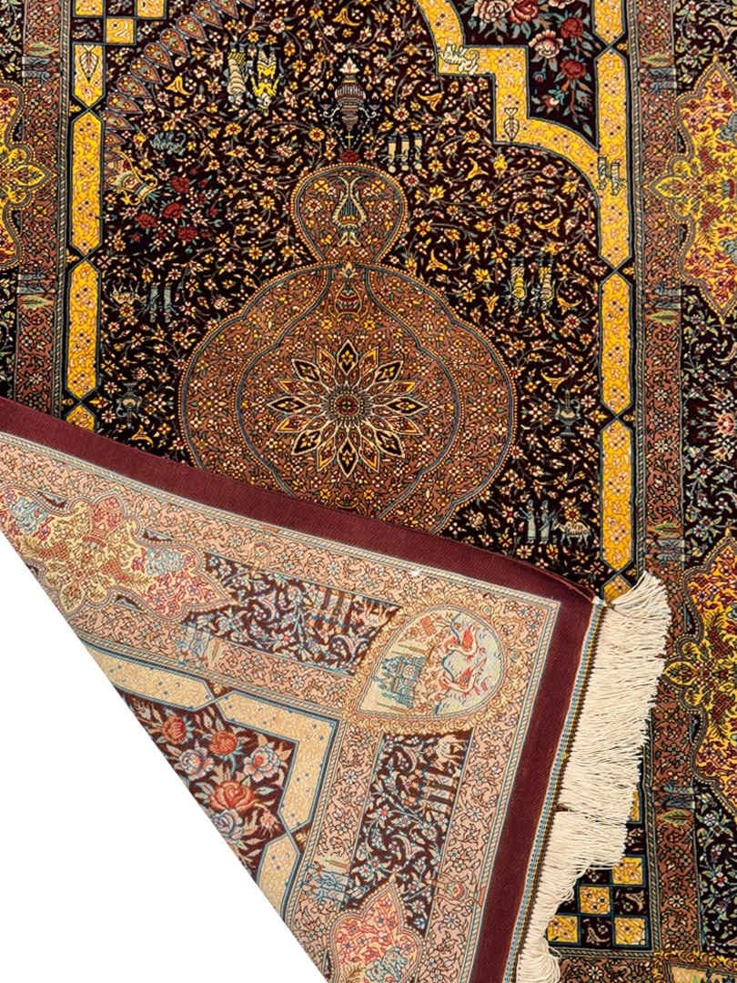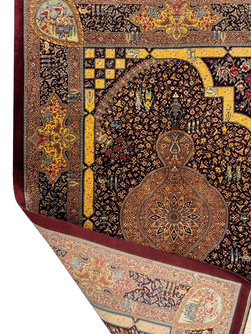 دست بافت قم 80*120 مستطيل طلاکوب 70 رج تمام ابريشم عنابي قهوه ايي 2 Kg