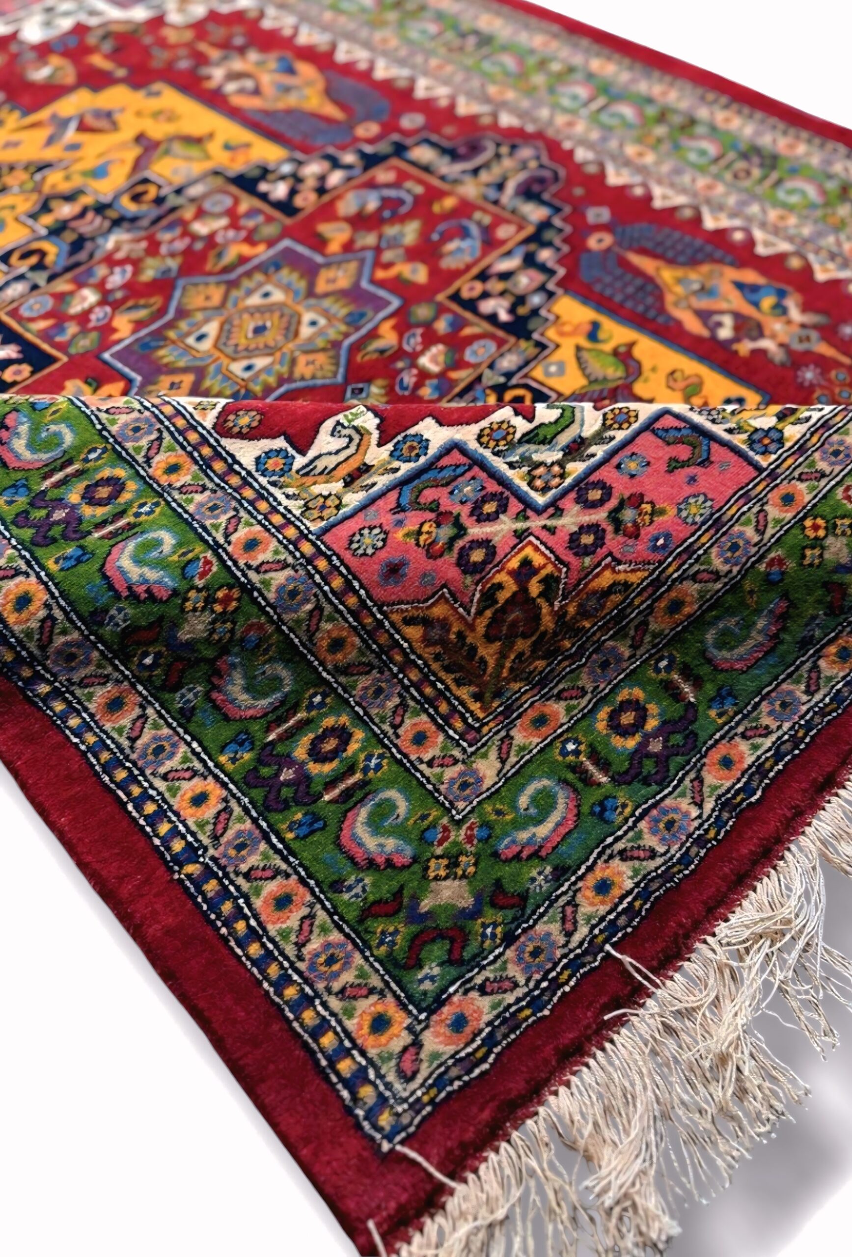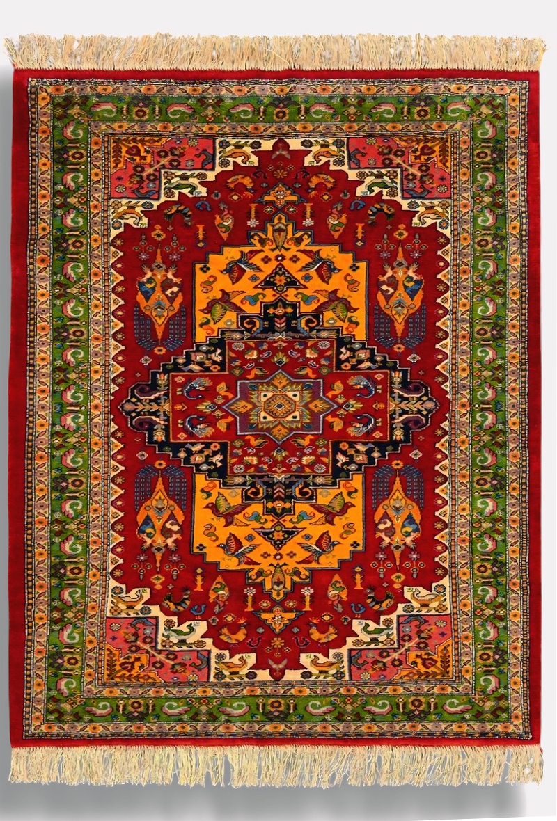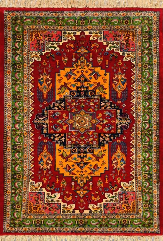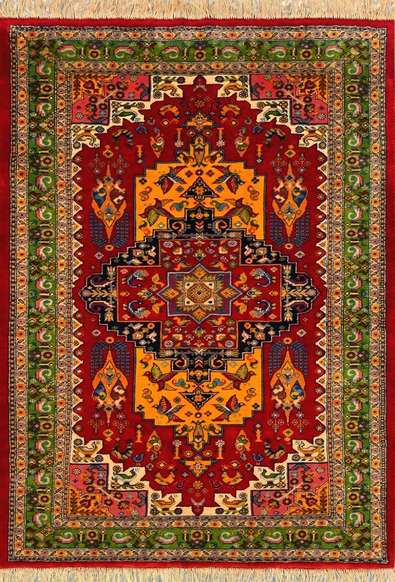 دست بافت قشقايي 100*150 مستطيل گل مرغي 40 رج پشم شرابي سبز 8 Kg