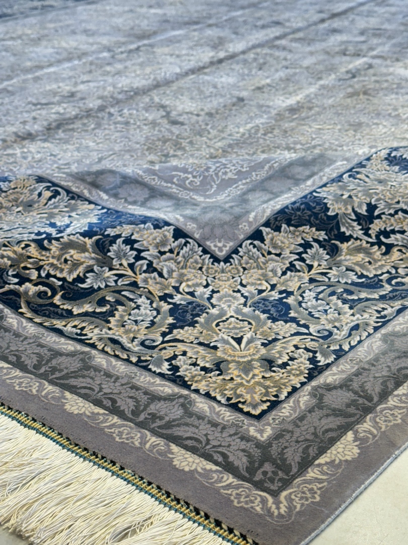 ربات بافت تمام ابريشم 2 نخ 250*350 مستطيل افشان جديد 70 رج کرک و بمبوسيلک طوسي طلايي سورمه ايي 25 Kg