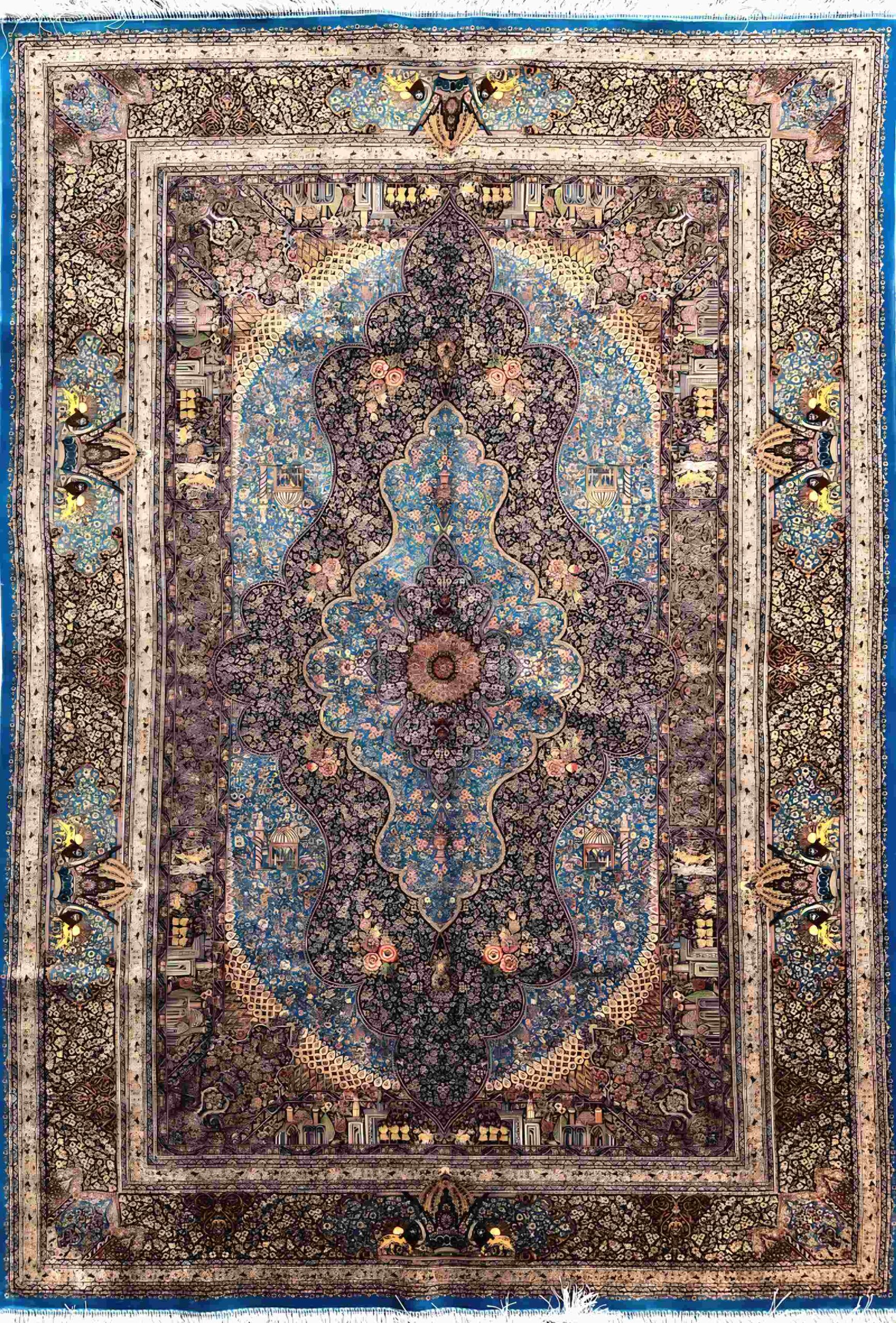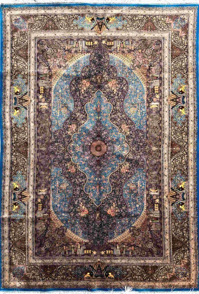 ربات بافت قم 150*225 مستطيل جمشيدي 70 ابريشم و بنبوسيلک فيروزه اي کرم 9 Kg