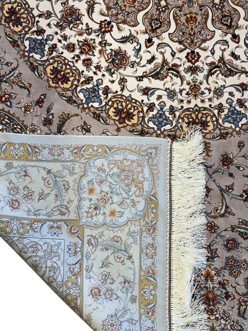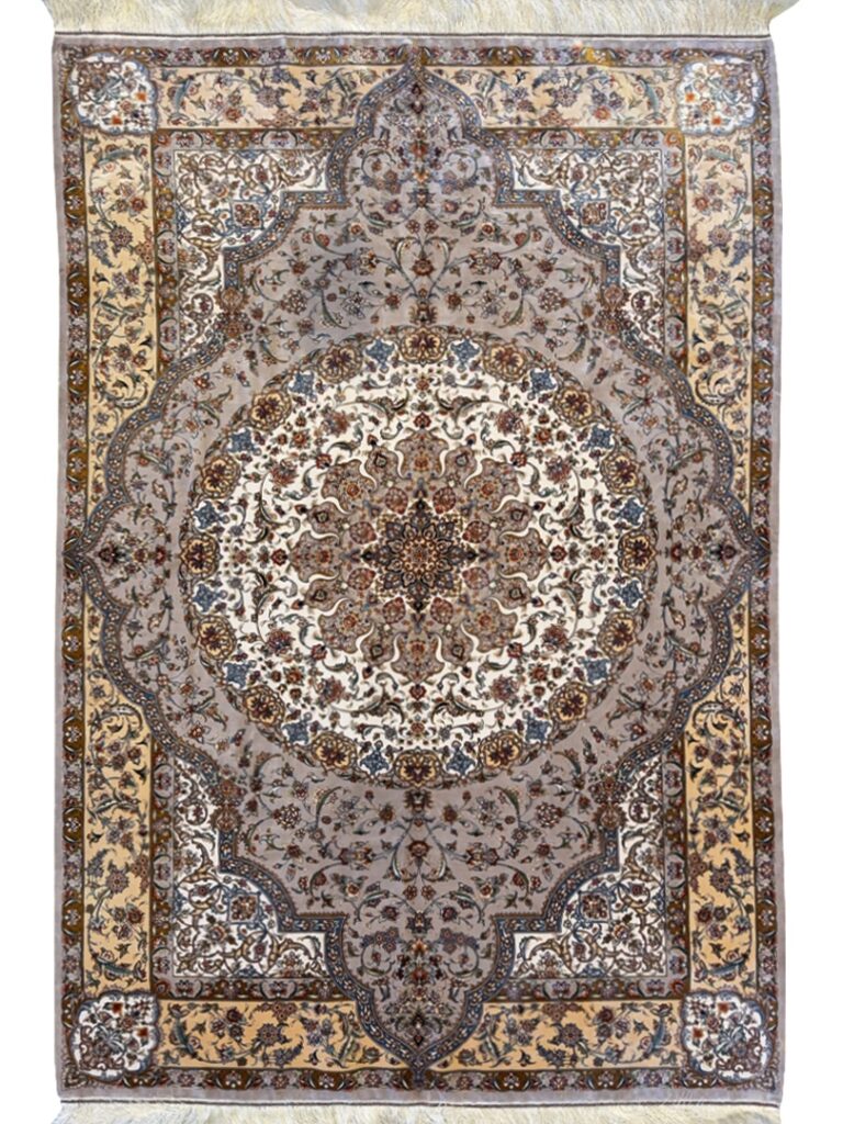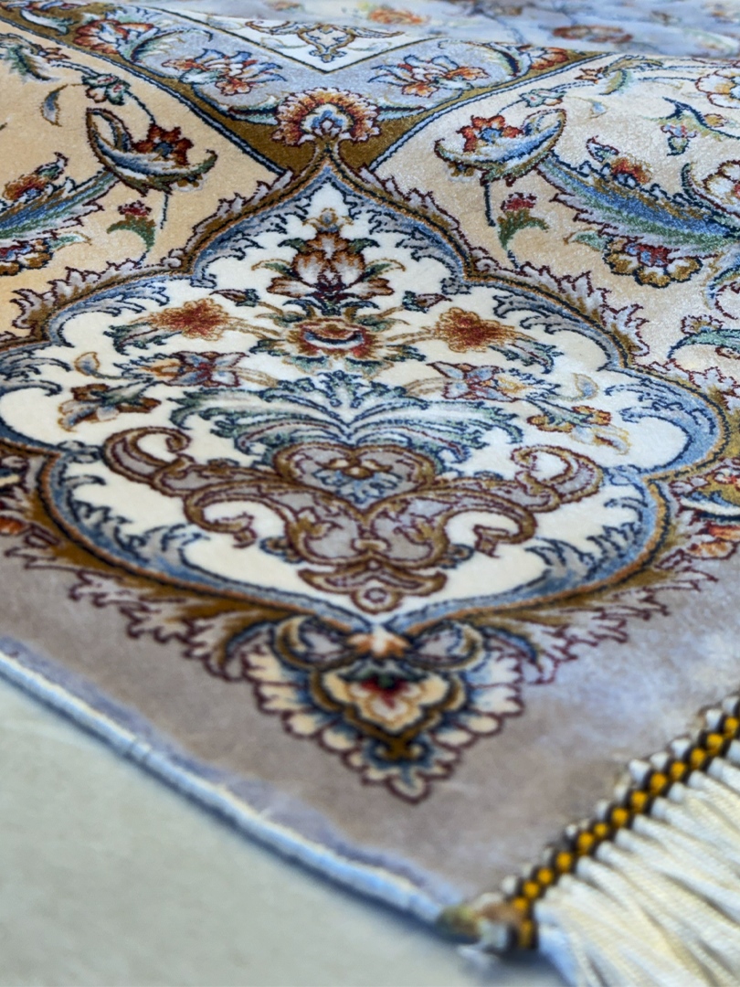 ربات بافت قم 150*225 مستطيل لچک ترنجي 70 رج ابريشم و بنبوسيلک نقرهاي کرم 8 Kg