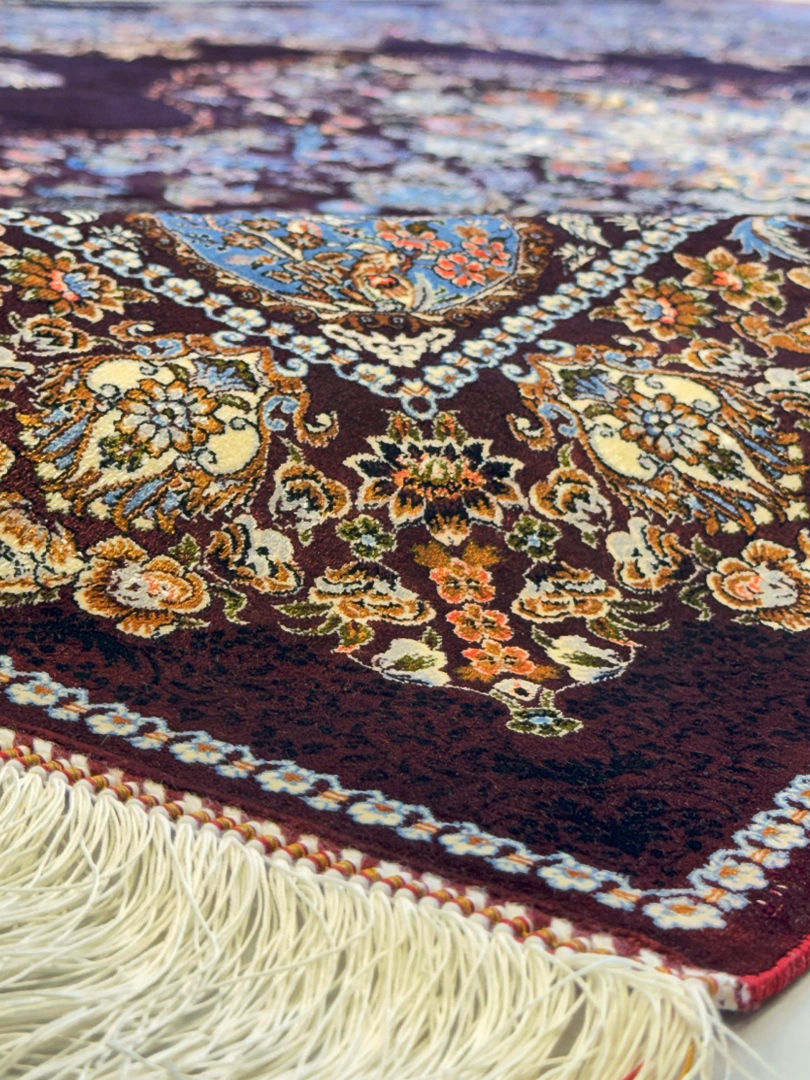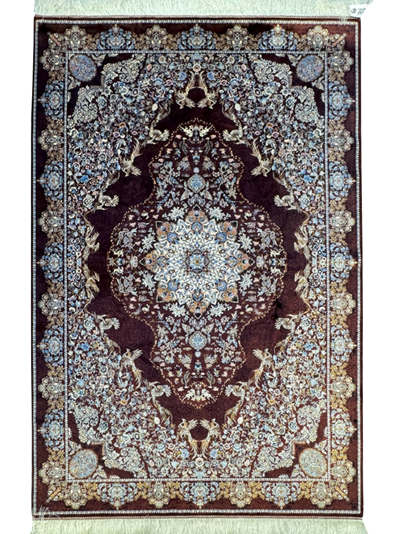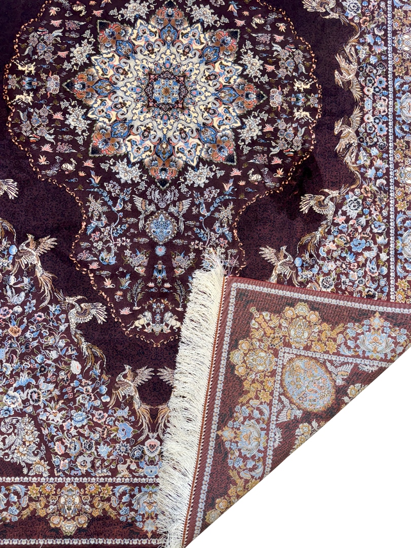 ربات بافت قم 150*225 مستطيل لچک ترنج باغ طاووس 70 رج ابريشم و بنبوسيلک عنابي عنابي 8 Kg