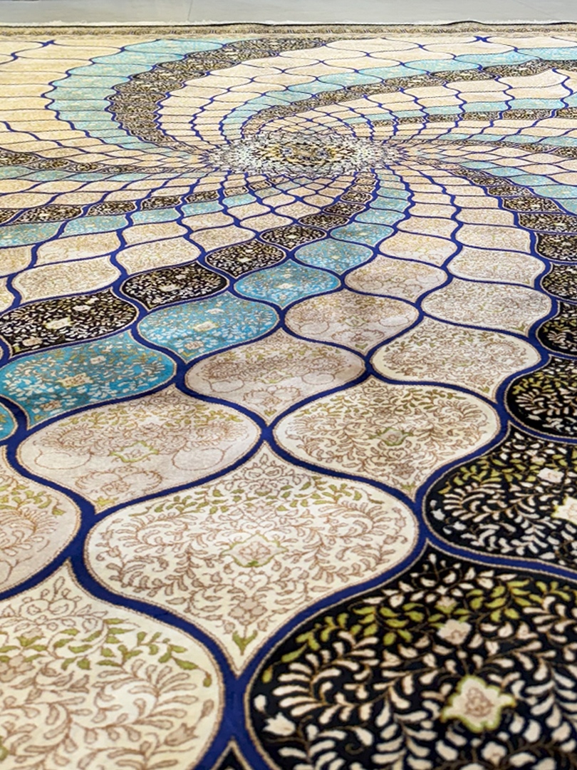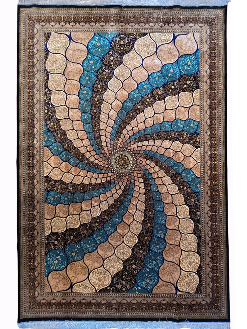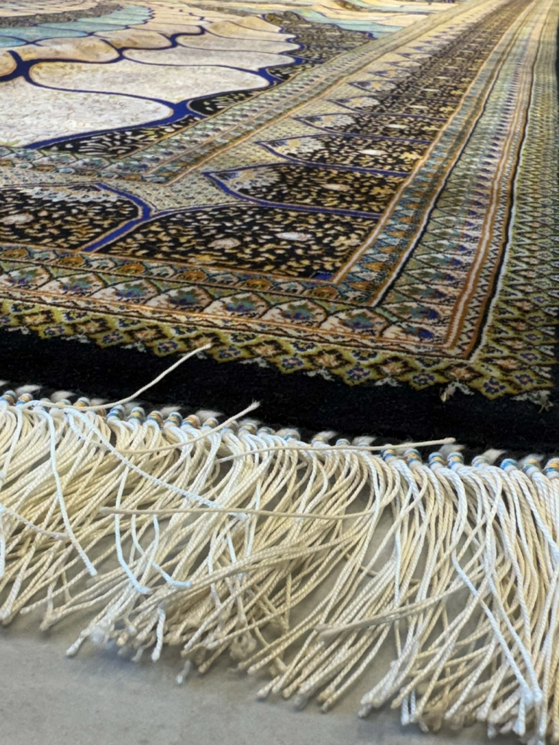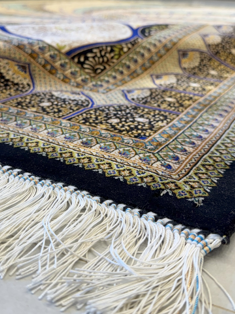 ربات بافت قم 200*300 مستطيل گنبدي 70 رج ابريشم و بنبوسيلک کرم مشکي کرم 17 Kg