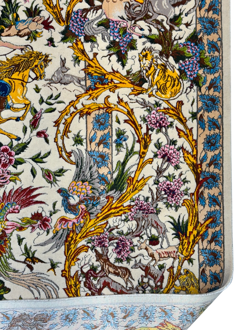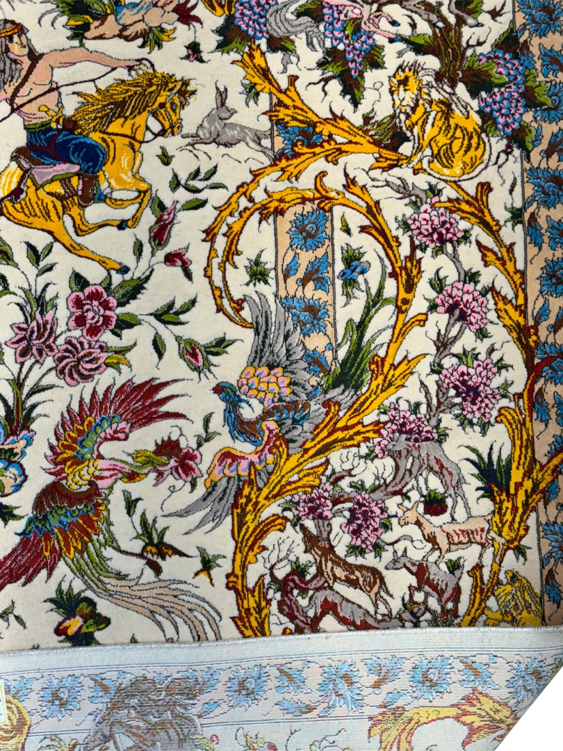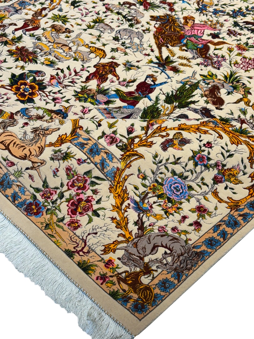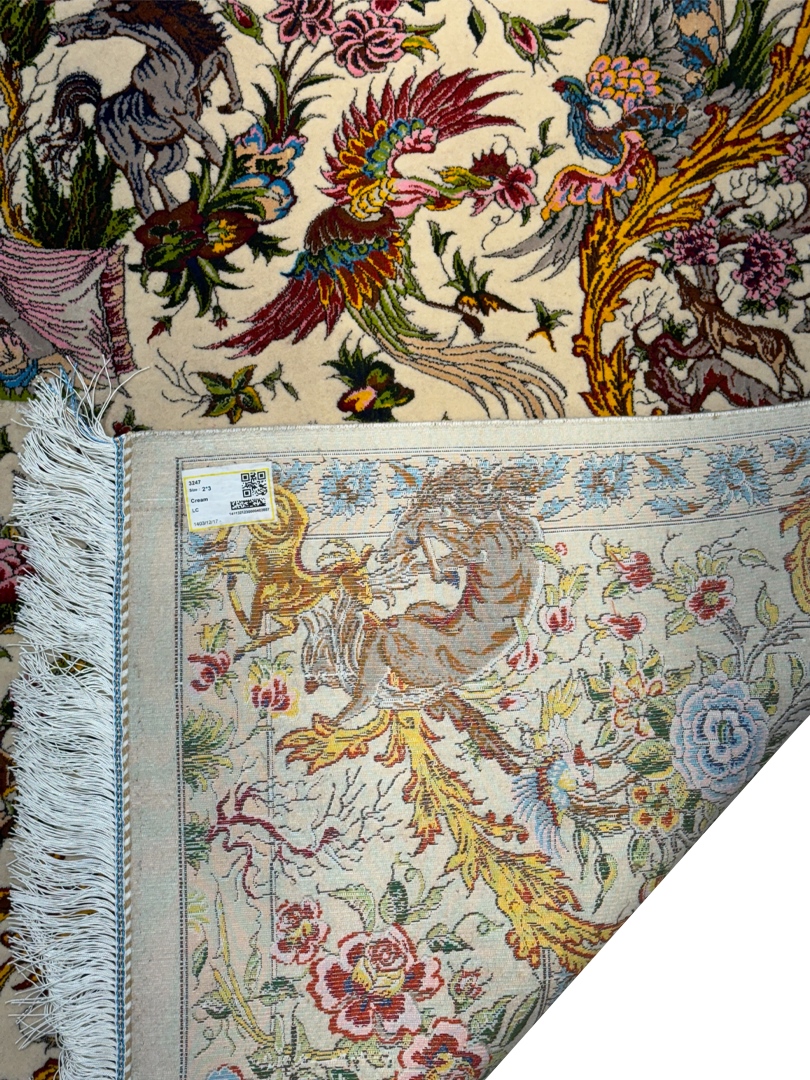 ربات بافت تبريز 200*300 مستطيل شکارگاه 70 رج پشم و ابريشم کرم کرم 17 Kg