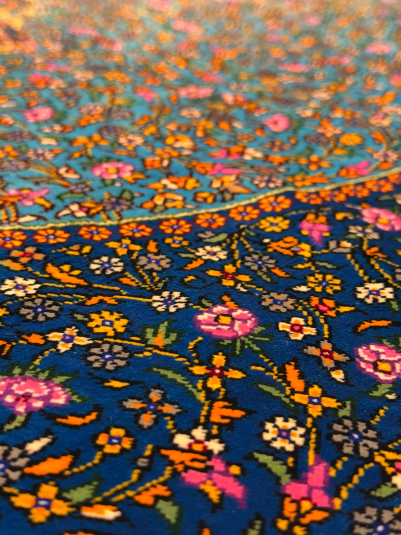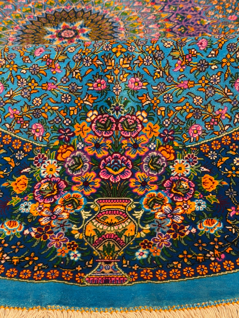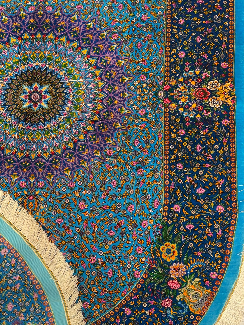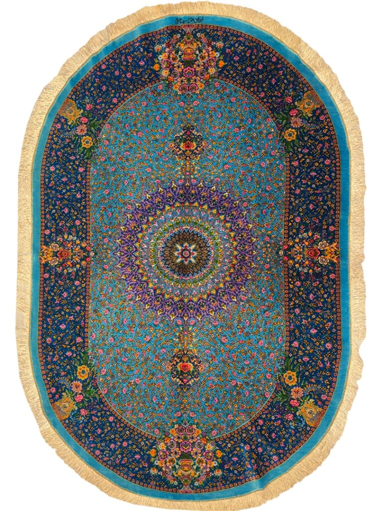 دست بافت قم 100*150 بيضي رضايي 80 رج تمام ابريشم ابي اسماني سورمه ايي 4 Kg