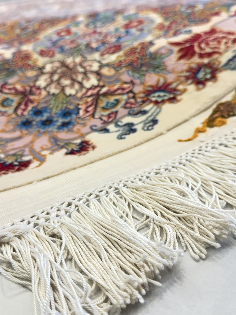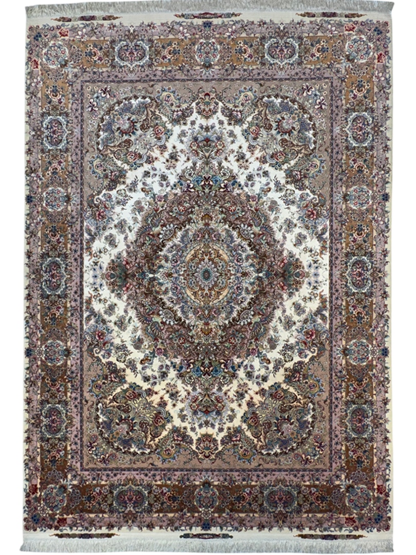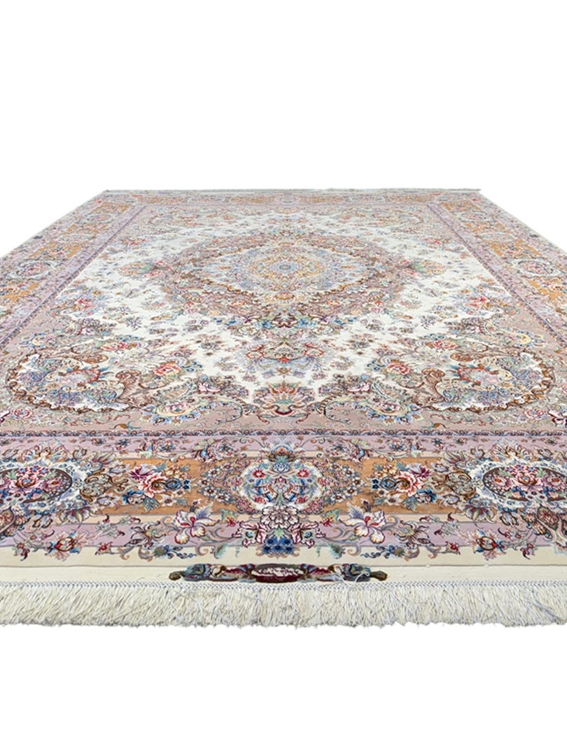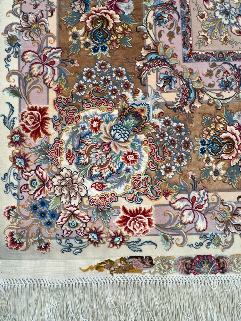 دست بافت تبريز 250*350 مستطيل خطيبي 60 رج کرک ابريشم با حاشيه ابريشم کرم الوان مسي 30 Kg