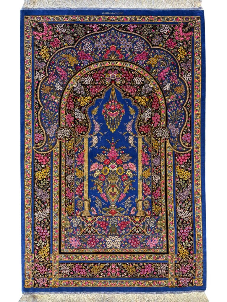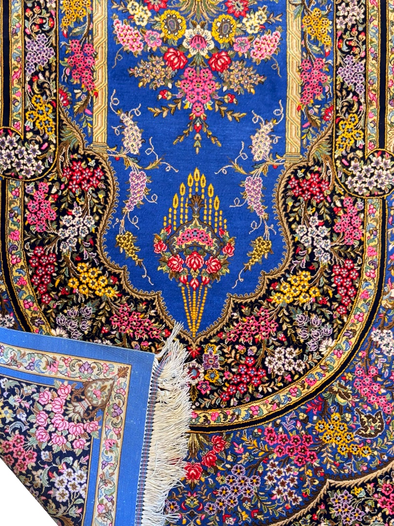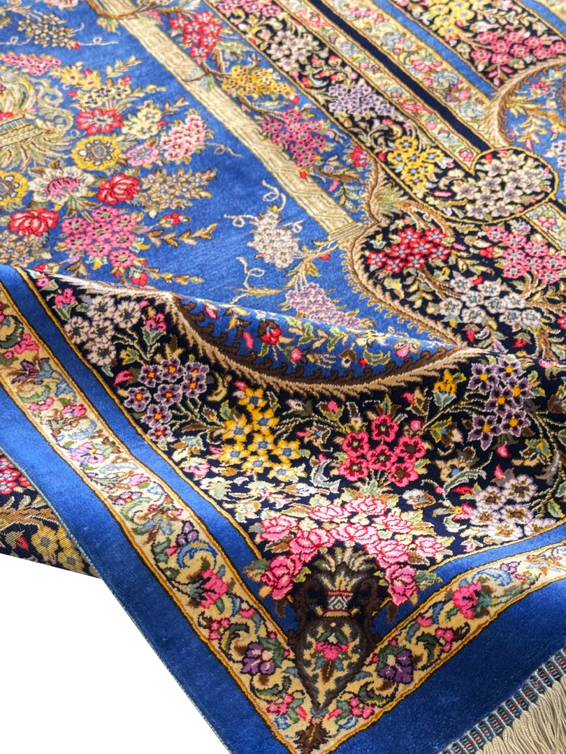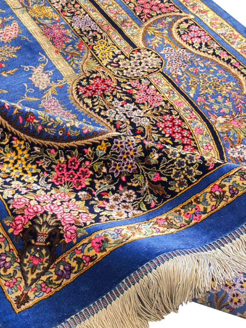 دست بافت تبريز 100*150 مستطيل محرابي گلداني 80 رج تمام ابريشم آبي گلداني سورمهاي 3 Kg
