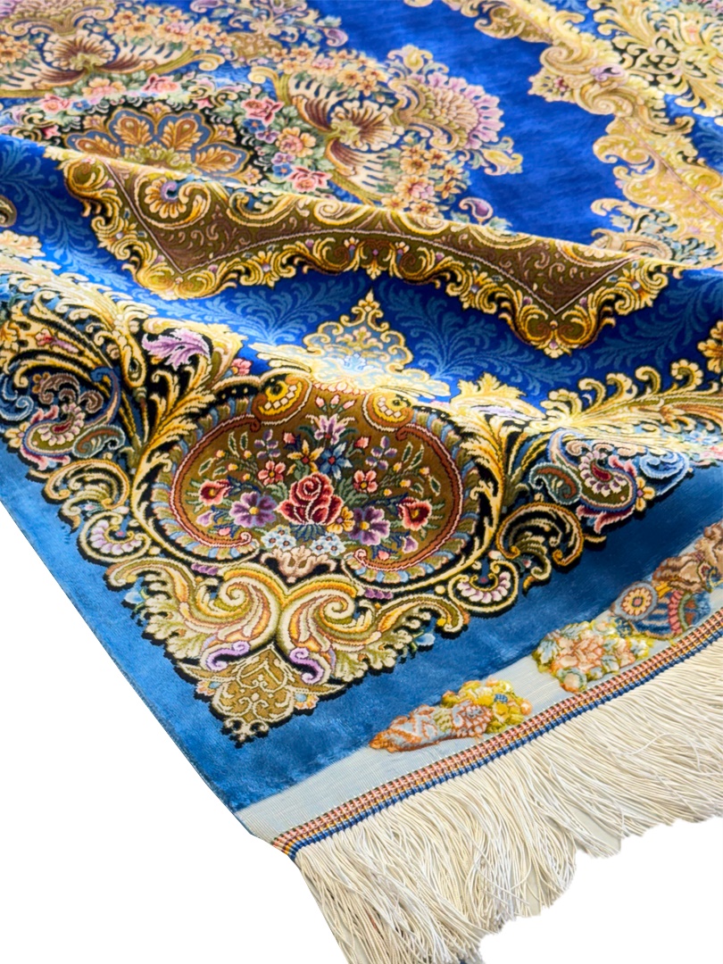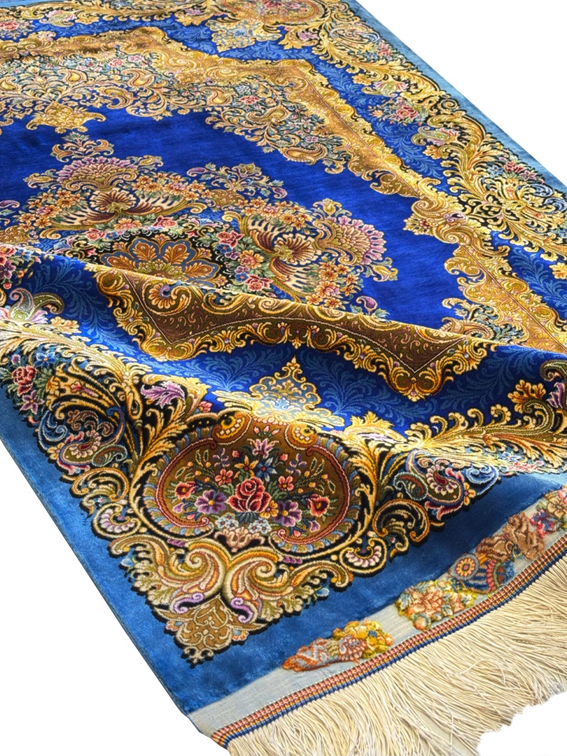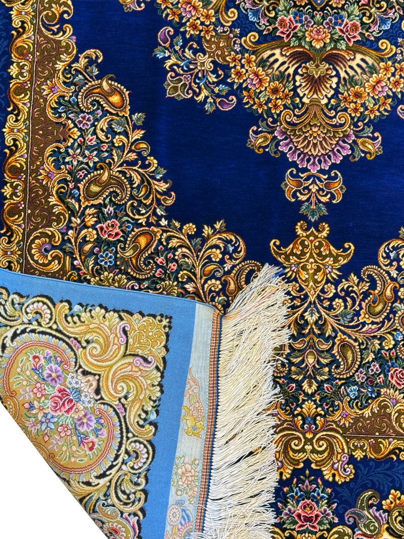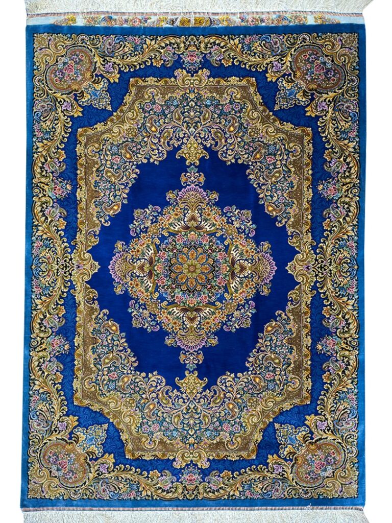 دست بافت تبريز 100*150 مستطيل محرري 80 رج تمام ابريشم آبي تيره طلايي 3 Kg