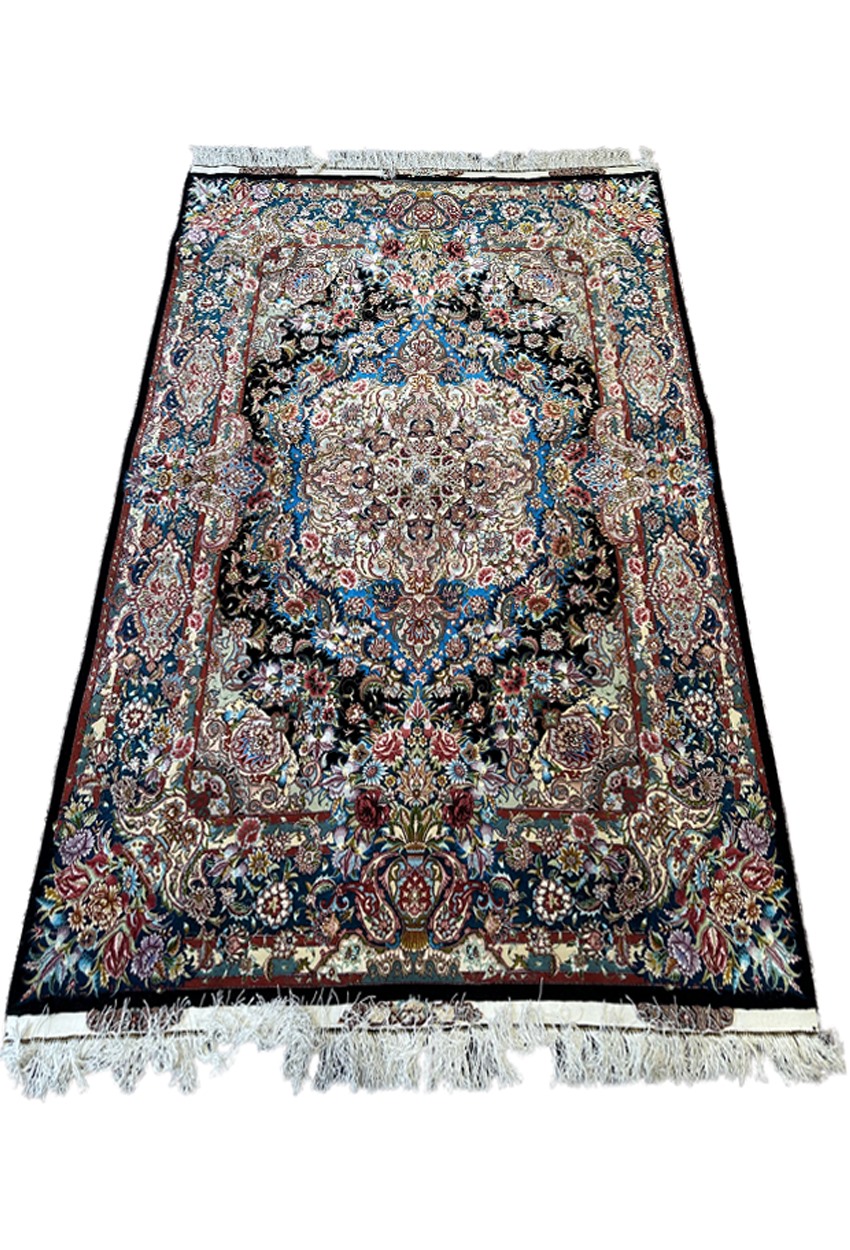 دست بافت تبريز 150*200 مستطيل سالاري 60 رج کرک و ابريشم سورمه‌اي يشمي 8 Kg