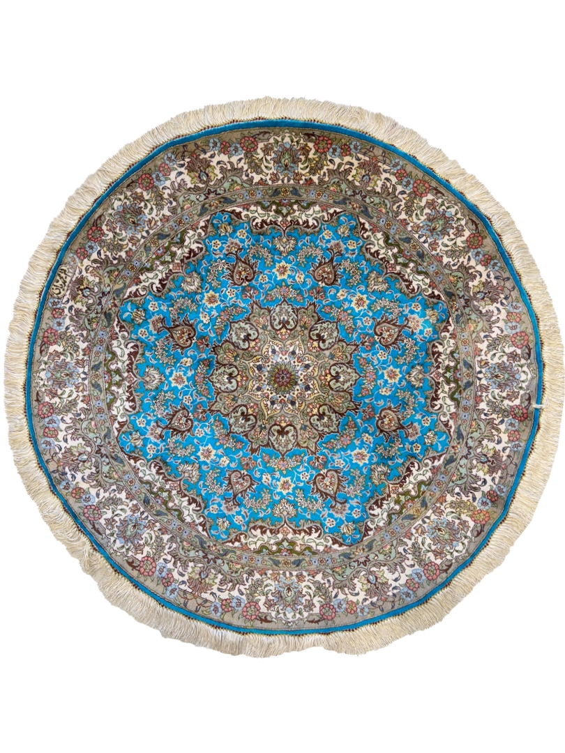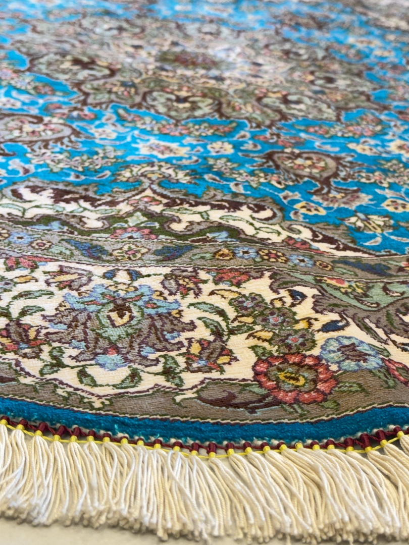 دست بافت قم 100*100 دايره محمديان 70 رج تمام ابريشم ابي اسماني کرم الوان 2 Kg