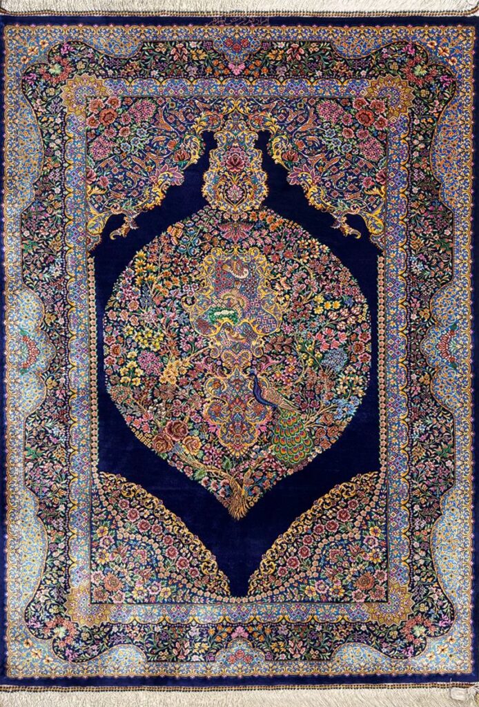 فرش دست بافت قم لچک ترنجی بهرامی 70 رج تمام ابریشم کد 2002847