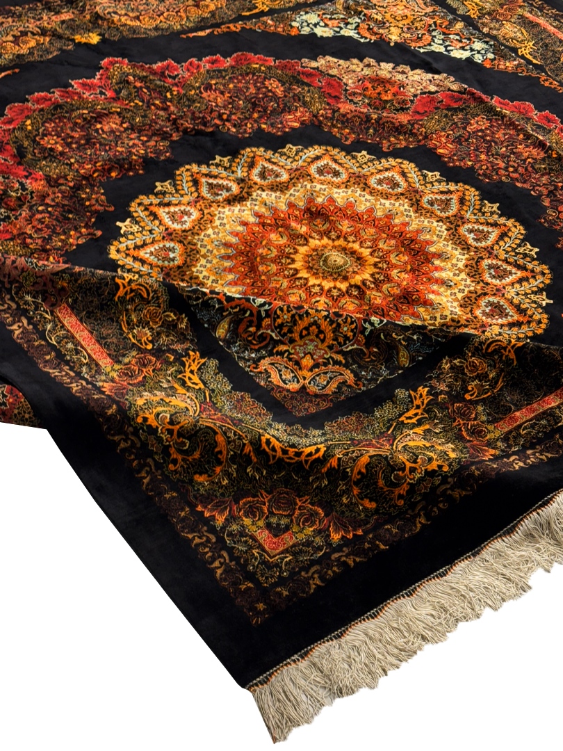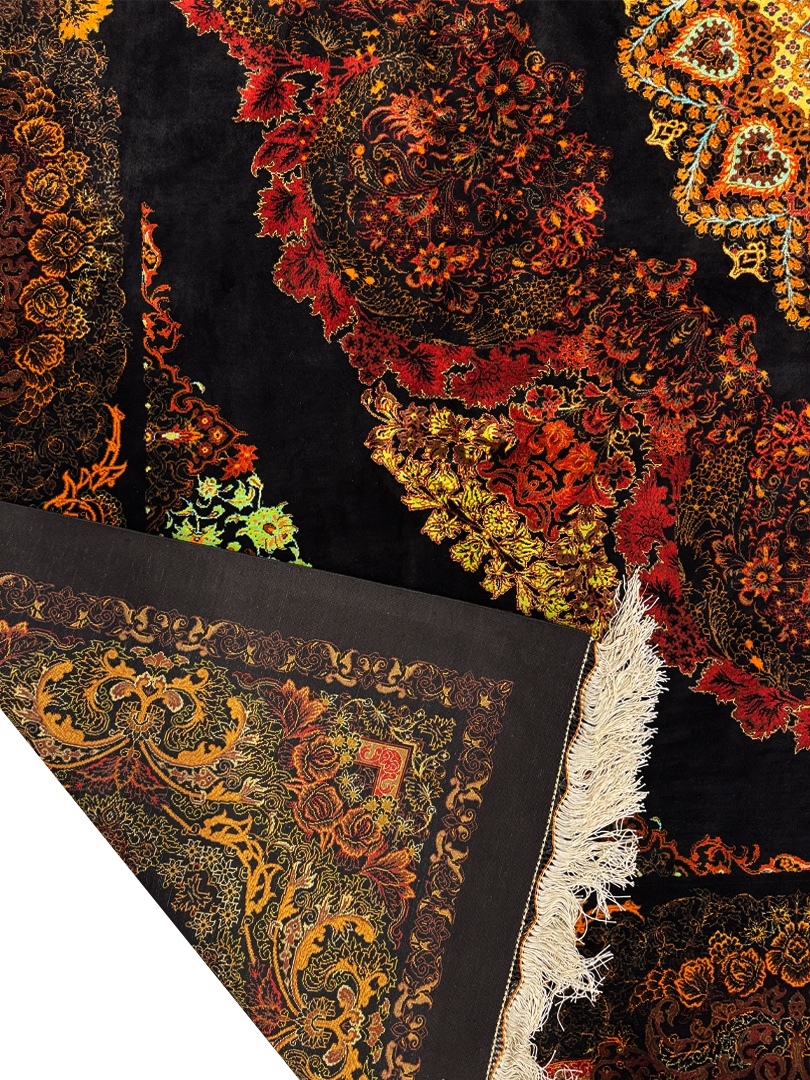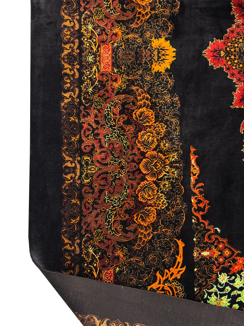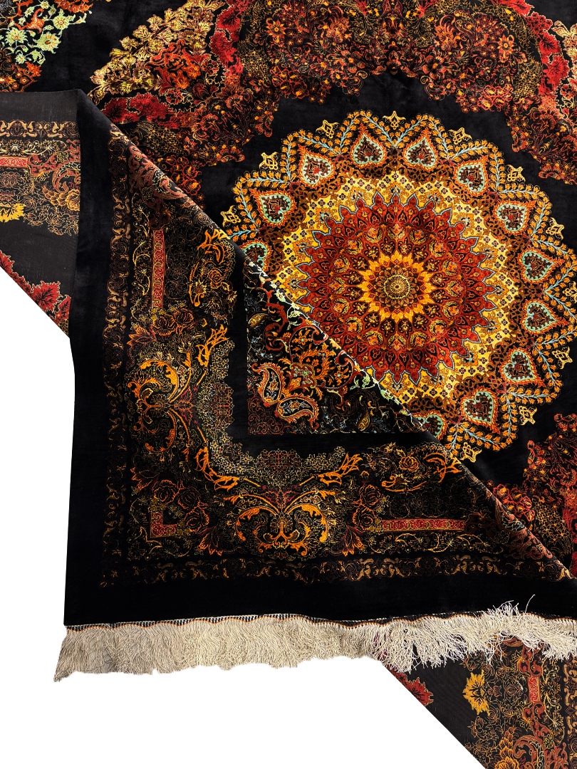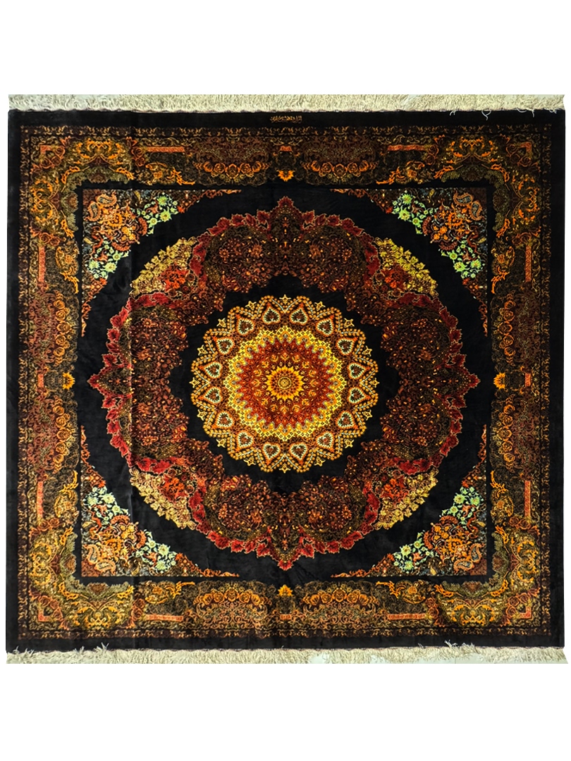 دست بافت قم 250*250 مربع رايمون 70 رج تمام ابريشم مشکي بنفش الوان 15 Kg
