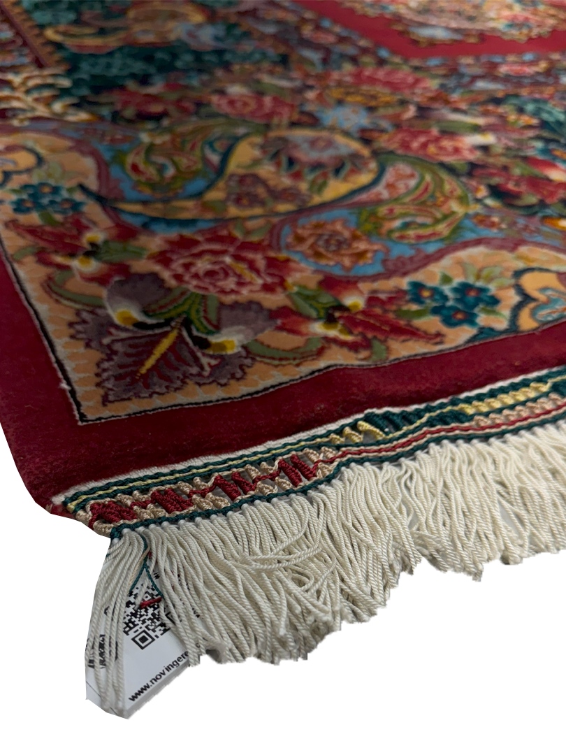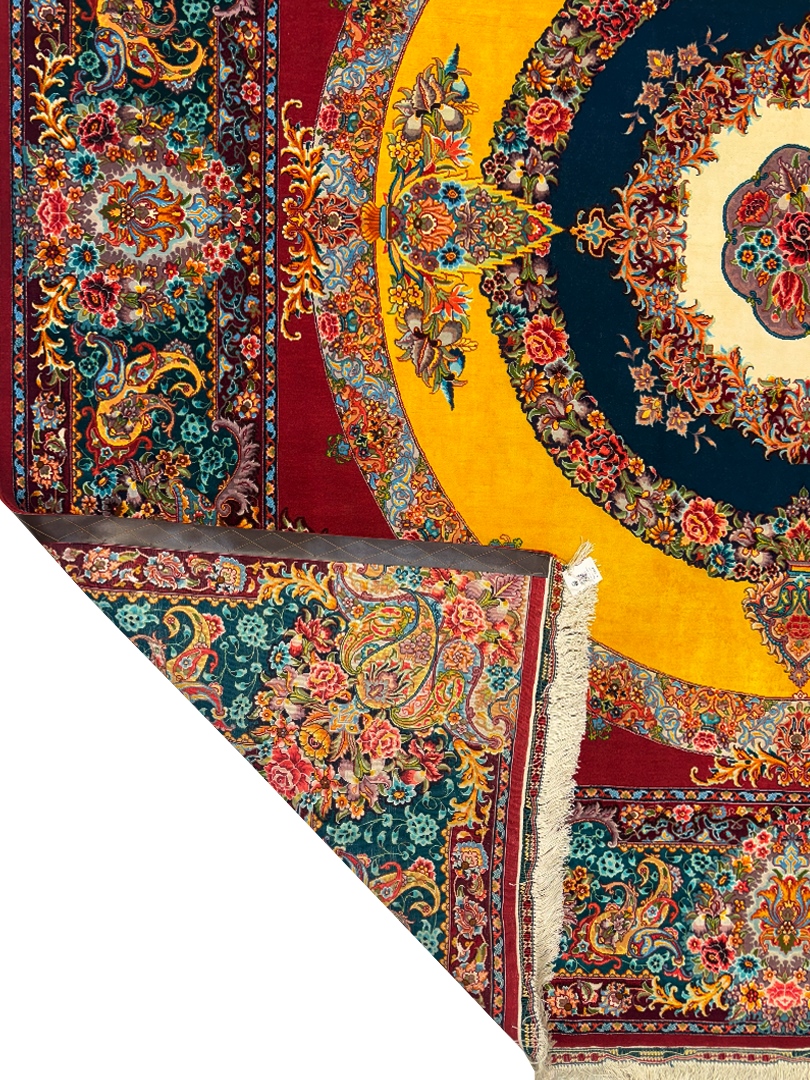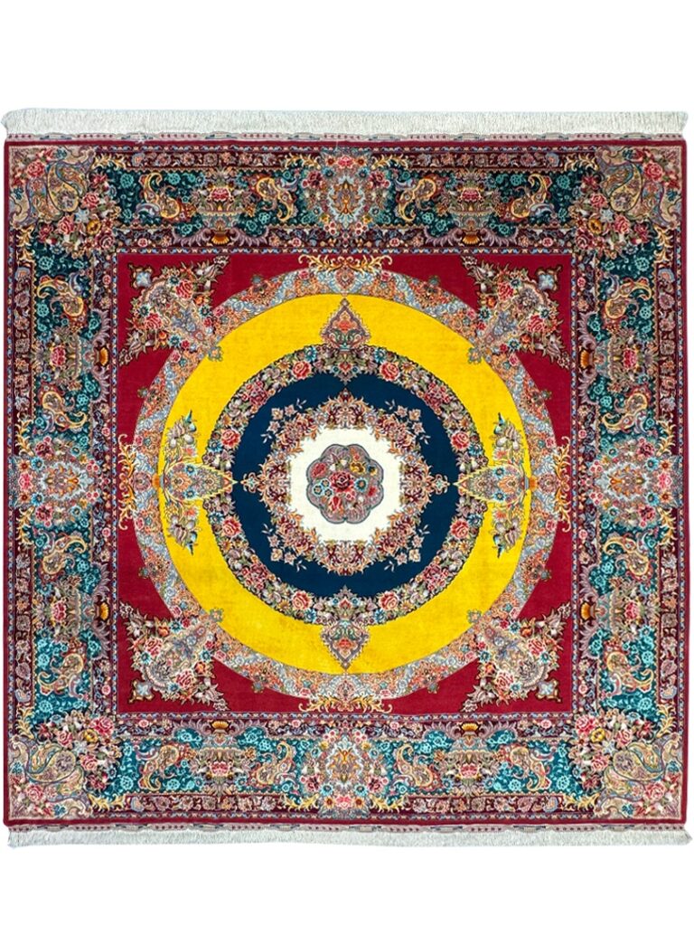 دست بافت تبريز 250*250 مربع سالاري 60 رج کرک و ابريشم سبز سبز طلايي 17 Kg