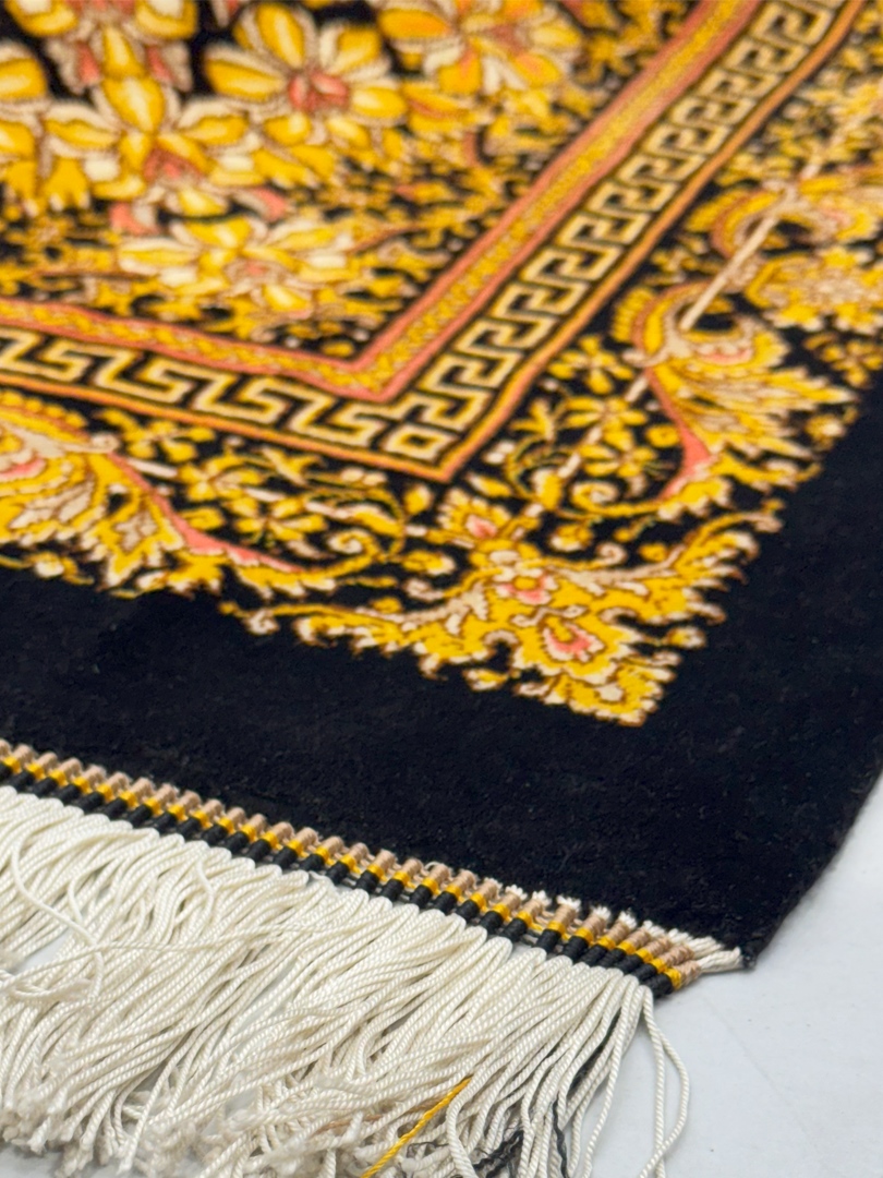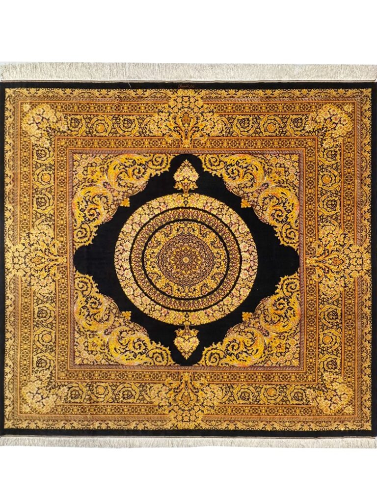 دست بافت قم 250*250 مربع لچک ترنجي ورساچ 80 رج تمام ابريشم مشکي طلايي مشکي طلايي 18 Kg