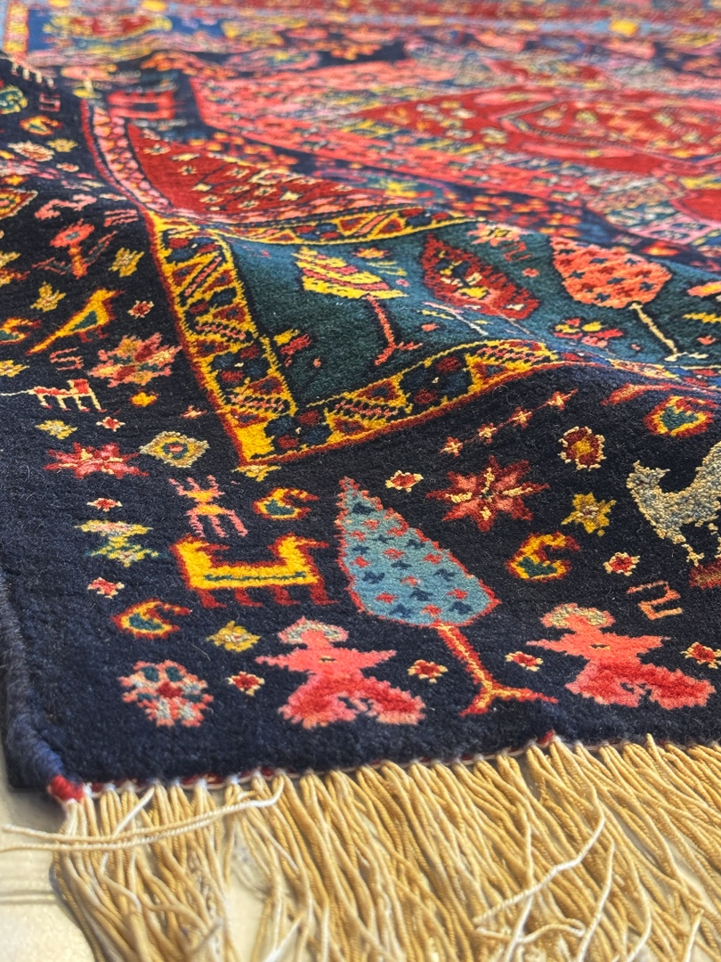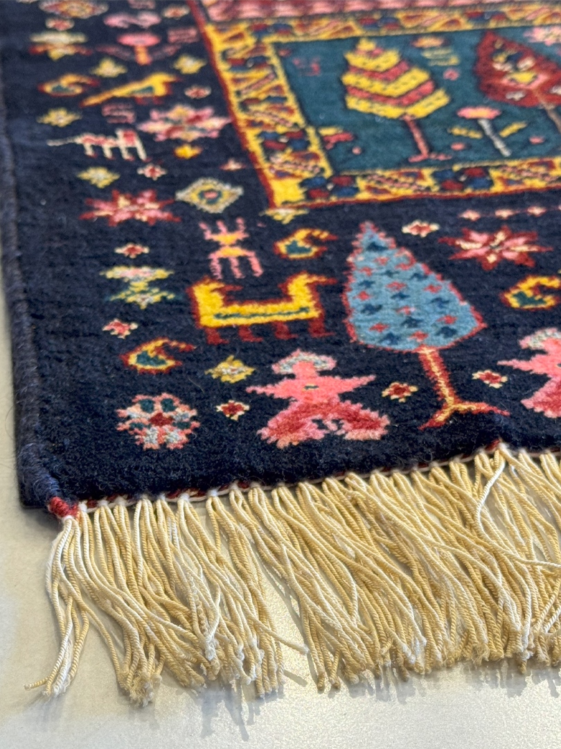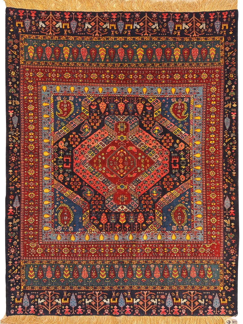 دست بافت عشايري 100*150 مستطيل ارمني زرتشتي 40 رج پشم و ابريشم سرمه اي سير قرمز لاکي 5 Kg