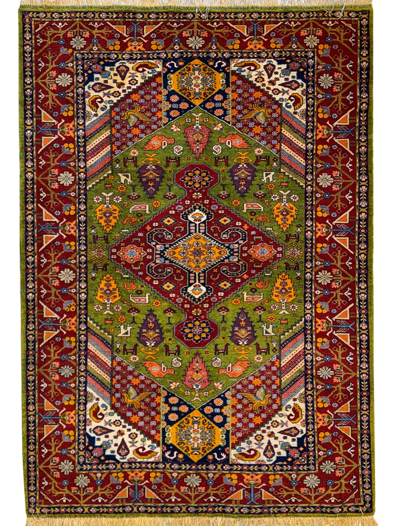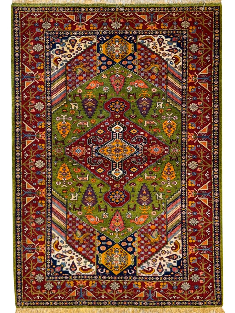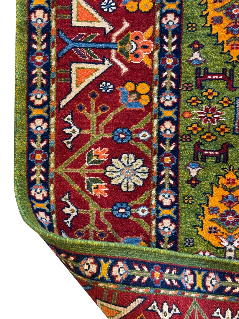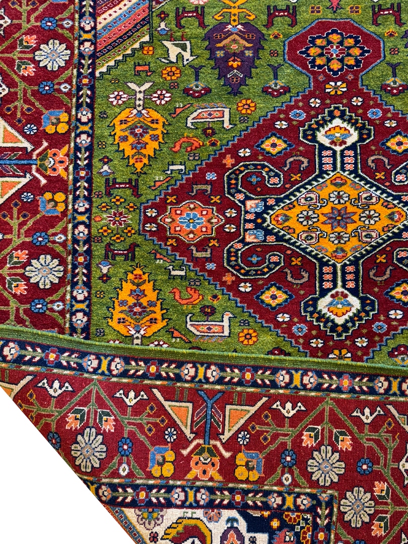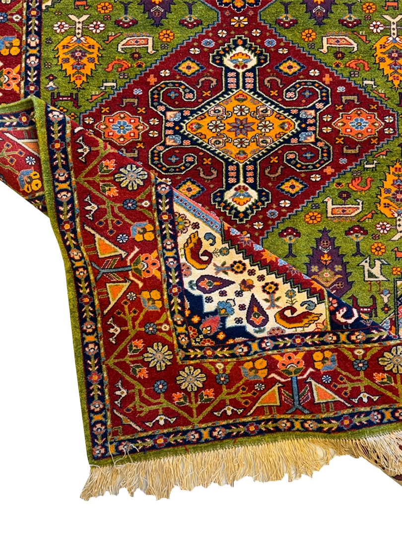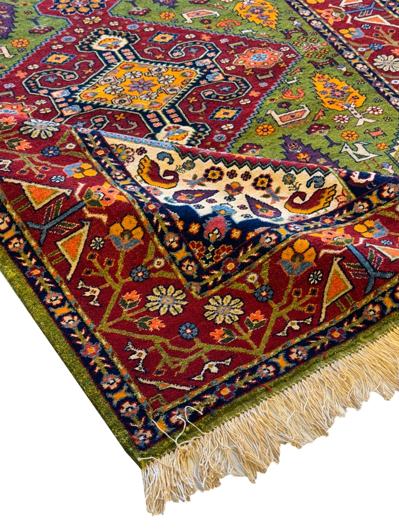 دست بافت قشقايي 200*134 مستطيل ارمي 45رج پشم و ابريشم سبز لاکي لاکي کرم 8 Kg