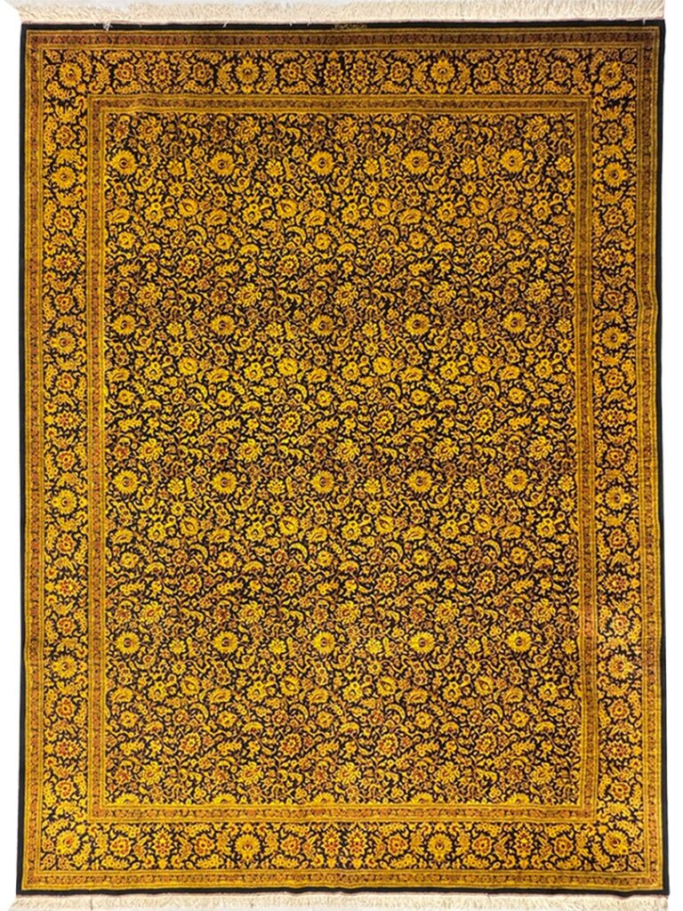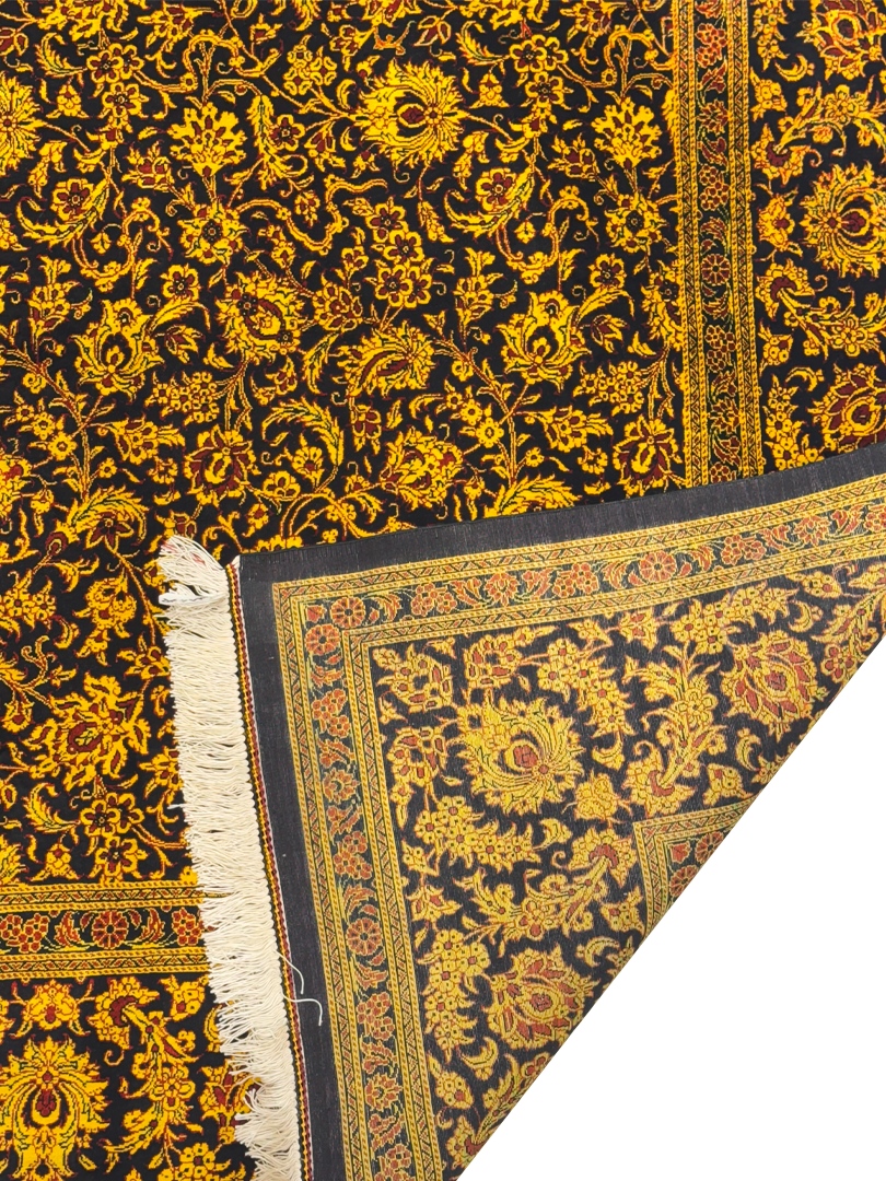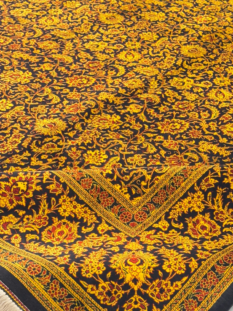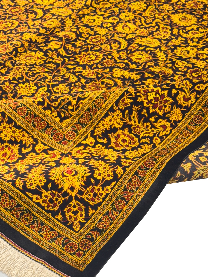 دست بافت قم 250*350 مستطيل افشان يکسره 70 رج تمام ابريشم مشکي طلايي طلايي 25 Kg
