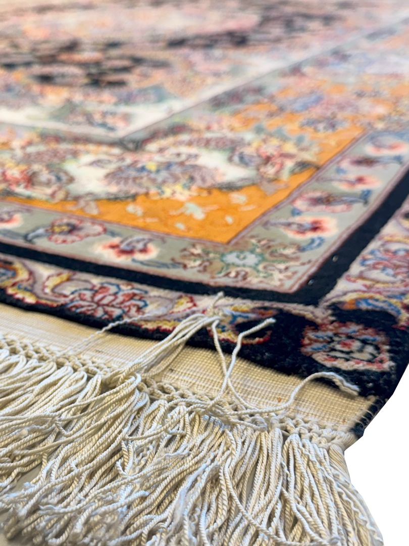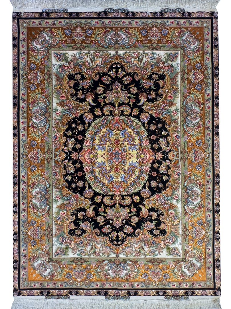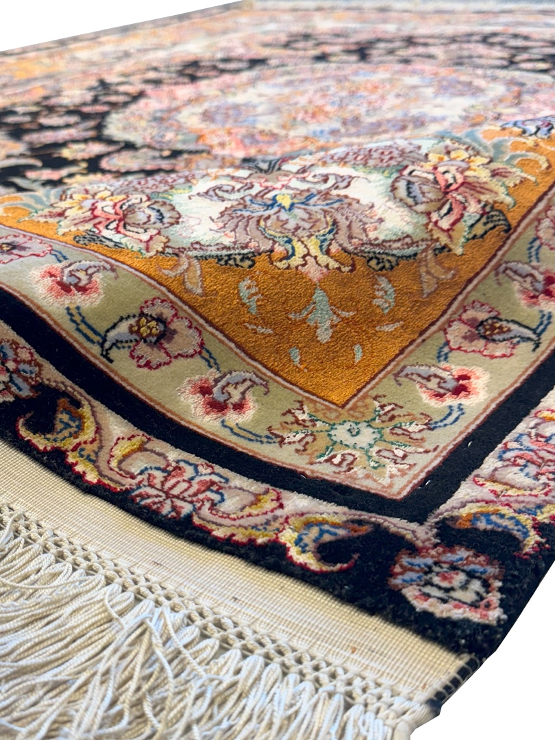 دست بافت تبريز 150*200 مستطيل اوليا 50 رج کرک و ابريشم مشکي طلايي 8 Kg