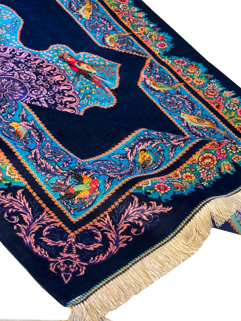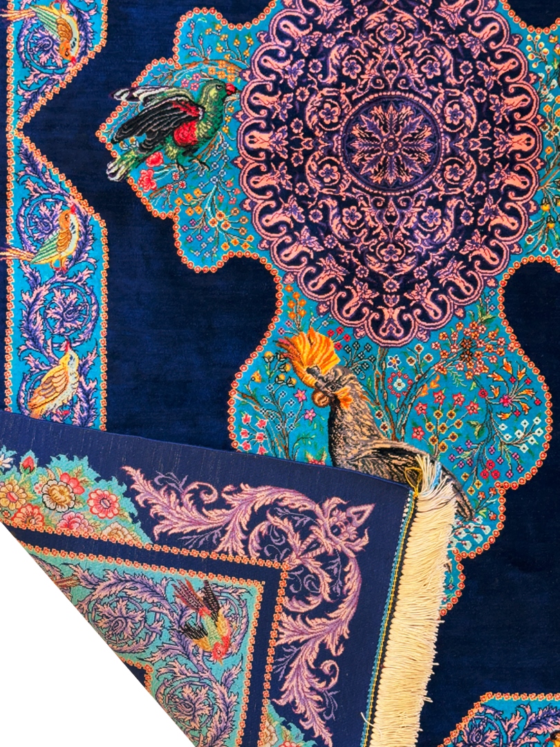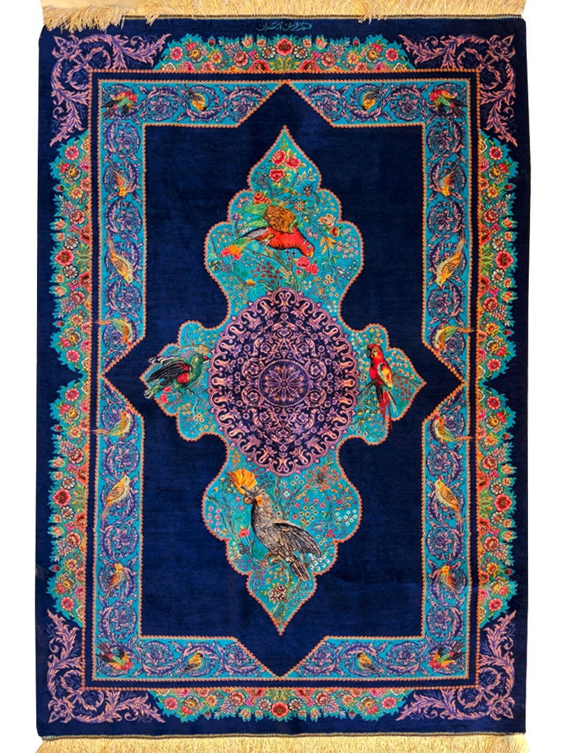 دست بافت قم 100*150 مستطيل باغ پرندگان اميران 70 رج تمام ابريشم سورمهاي سورمهاي kg1