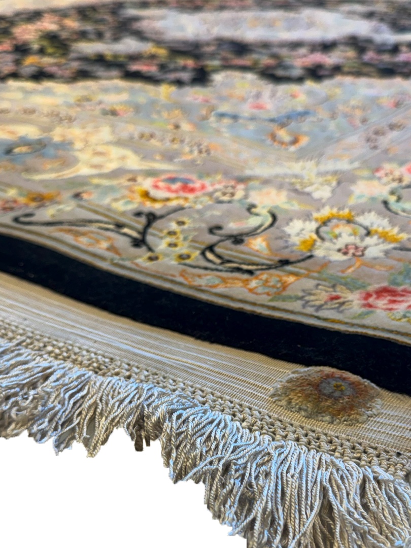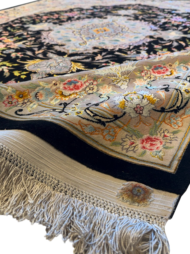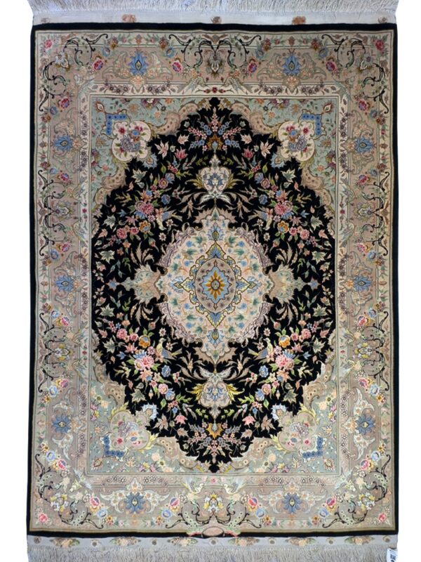 دست بافت تبريز 150*200 مستطيل تقي زاده 70 رج کرک و ابريشم مشکي کرم 6 Kg