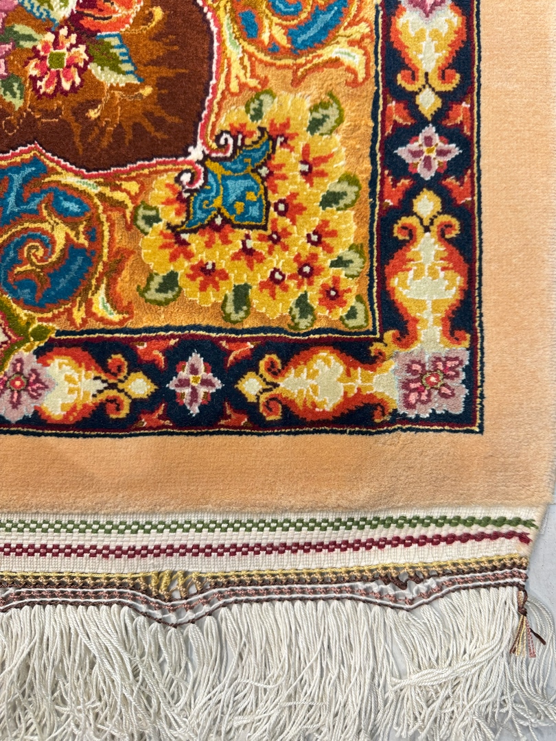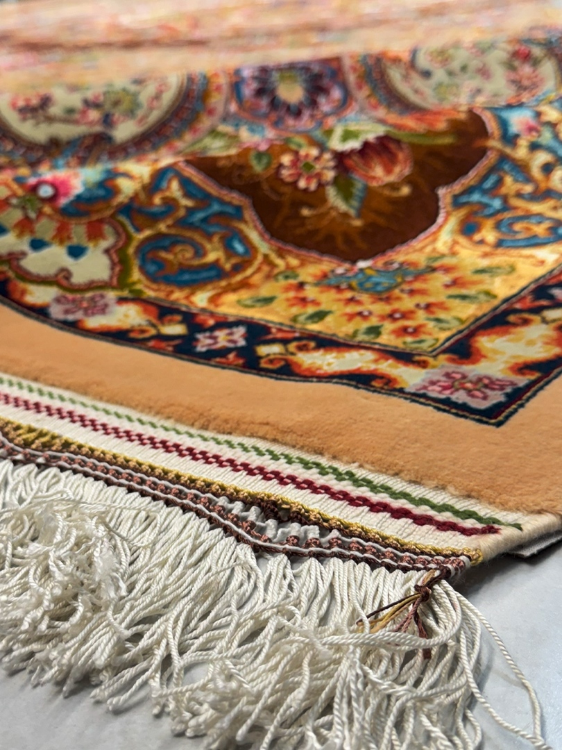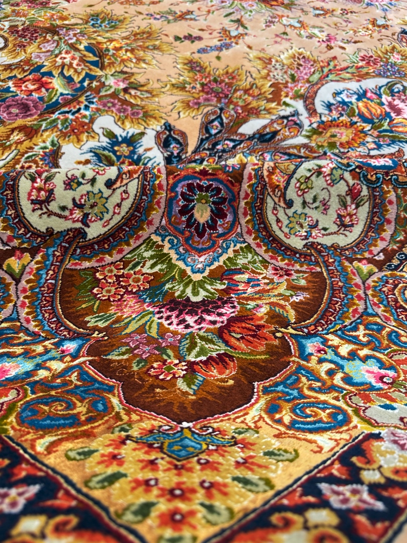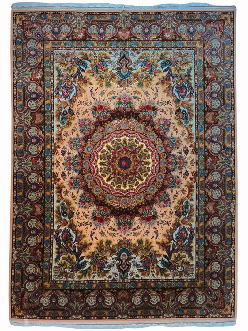 دست بافت تبريز 400*600 مستطيل حمزه 60 رج کرک و ابريشم نسکافهاي کرم دارچيني k60