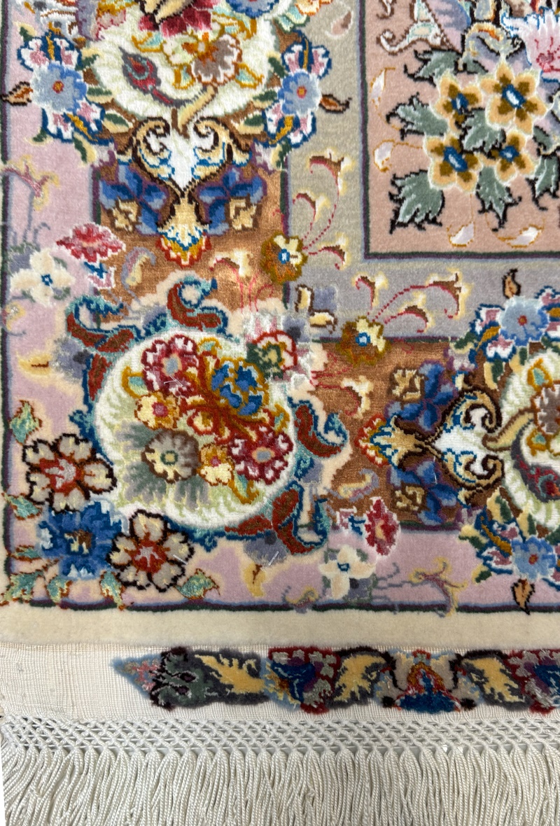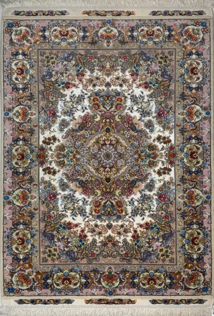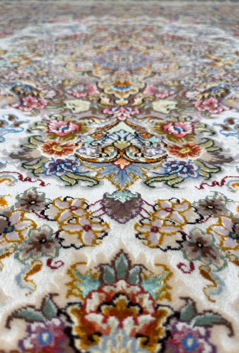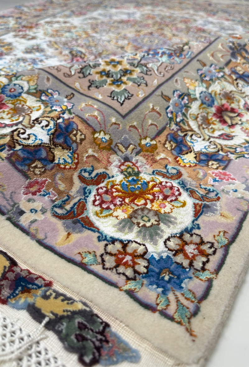 دست بافت تبريز 100*150 مستطيل خطيبي اصطلاحا 60 رج کرک و ابريشم کرم کرم ياسي 5 Kg