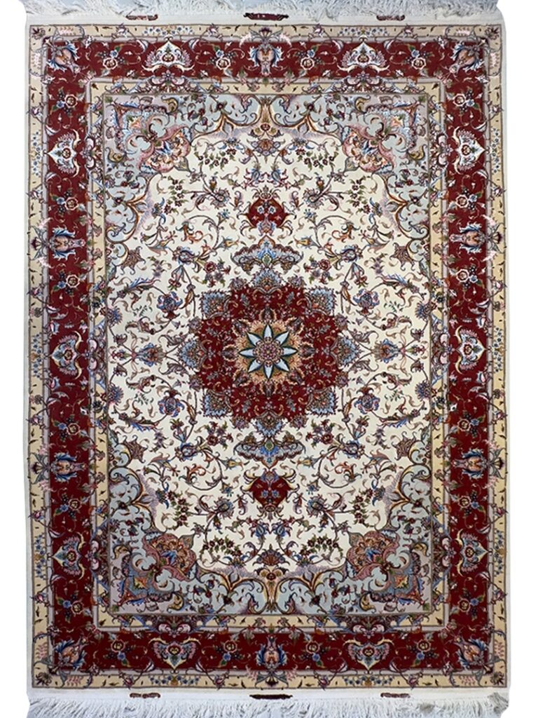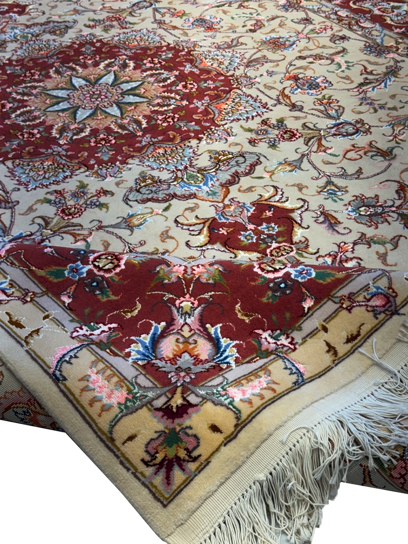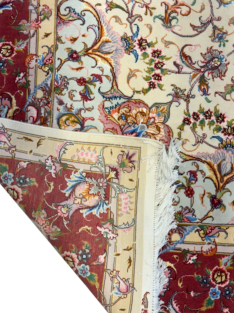 دست بافت تبريز 200*300 مستطيل عليا 40 رج کرک و ابريشم کرم مسي 14 Kg