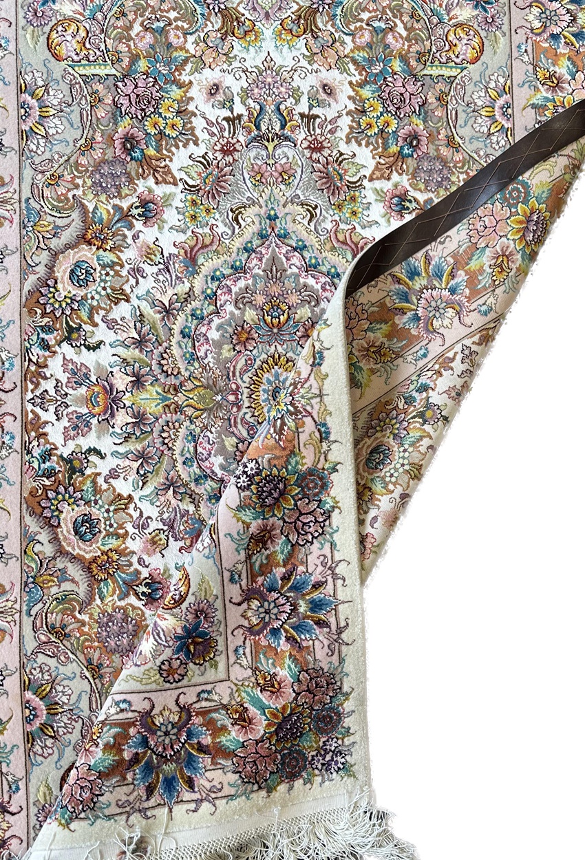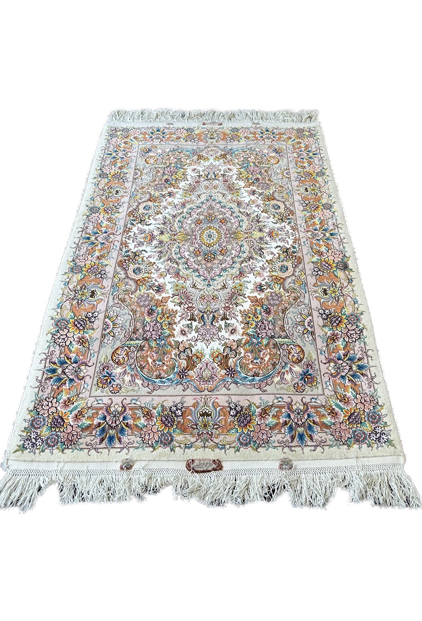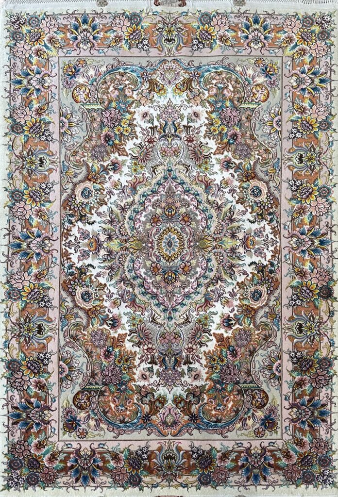 دست بافت تبريز 100*150 مستطيل خطيبي 50 رج دو متن ابريشم کرم مسي 7 Kg