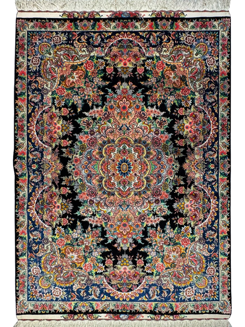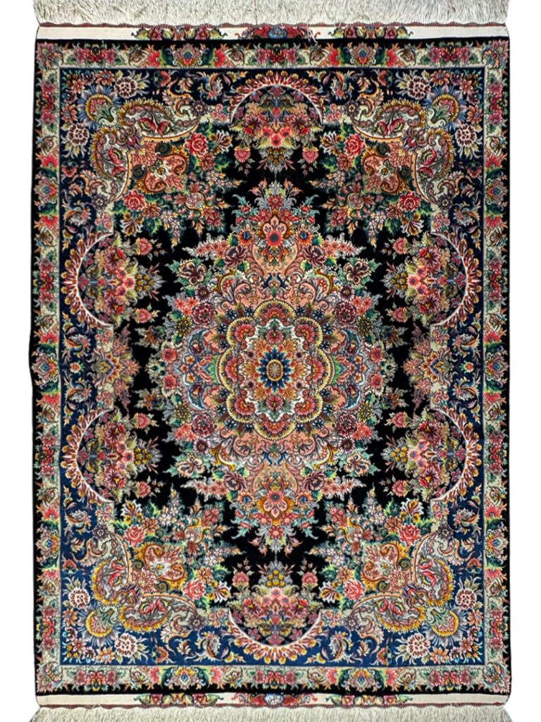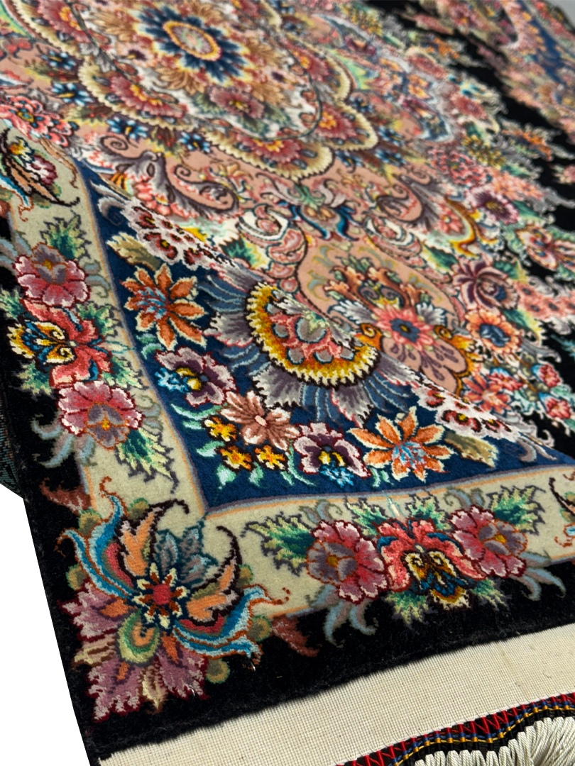 دست بافت تبريز 150*200 مستطيل خطيبي 52 رج کرک و ابريشم مشکي الوان ابي الوان 7 Kg